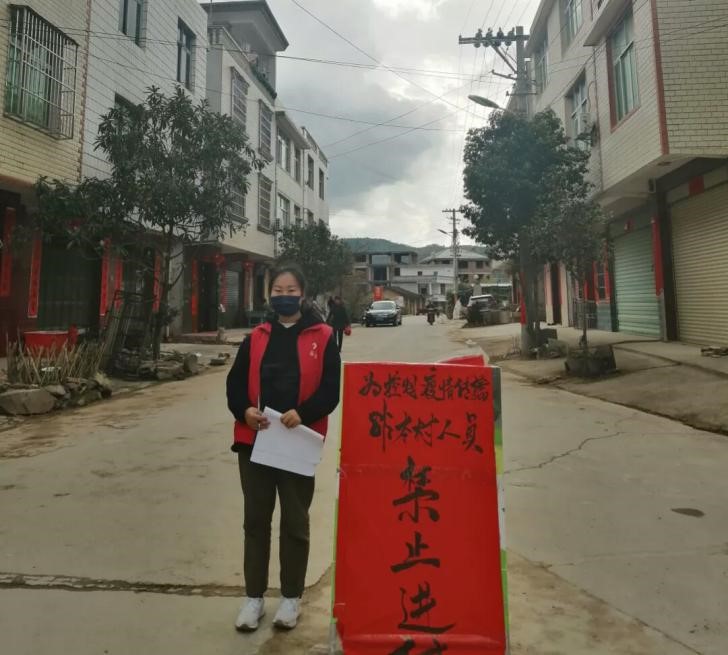 19影像304班林文娣同学在福建省龙岩市连城县莒溪镇壁洲村做志愿工作,她的任务是登记往来车辆并为其车辆里的人员测量体温,阻止外村人进村。她说:“作为一名医学生,我虽不能到一线去冲锋陷阵,但我会尽我所能去加强村民们的安全意识,会承担起对社会的责任。中国加油,武汉加油。待到春暖花开时,我们再相约武汉赏樱花。”