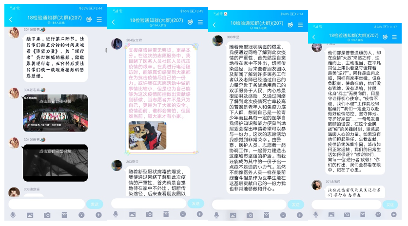 团支书组织同学们观看《国家力量》为“逆行者”助威的视频,致敬最美逆行者。在假期利用空余时间参与防疫志愿服务的志愿者们,也向大家分享自己在志愿服务过程中的感受与感悟,同学们纷纷为其点赞!张宏亮同学表示:“第一次在线上开团日感触很深刻,抗疫医务工作人员那种奋不顾身, 舍己为人的精神, 彰显了医者的使命与担当, 是我们的学习榜样!也体会到了大家对抗疫医务工作人员那一股崇高的敬意和要向他们学习的精神。”