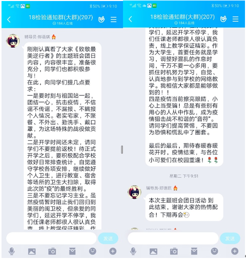 辅导员龙梅梅老师在团日活动中针对疫情做了分析,提醒同学们在家学习,减少外出,提高警惕,保护好自己的安全。同学们手写祝福语,用优美的文字表达对祖国对武汉的祝福!罗沁琳同学说:“这次团日虽然和之前的开展方式有所不同,但是意义非凡。辅导员在班会上为我们科普了新型冠状病毒和防范它的知识以及现在的疫情情况,还关注我们的学习情况,鼓励大家在疫情期间也要努力学习。我们也用手写字,表达了对武汉同胞们的祝福,相信只要我们坚定信心就一定能够打赢这场防疫攻坚战!”