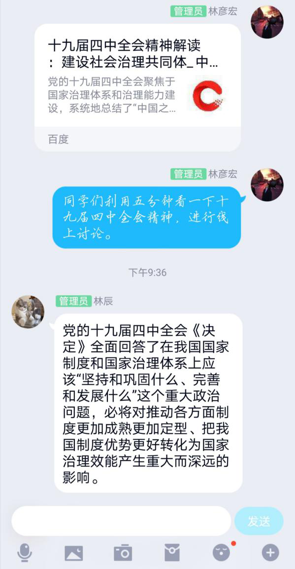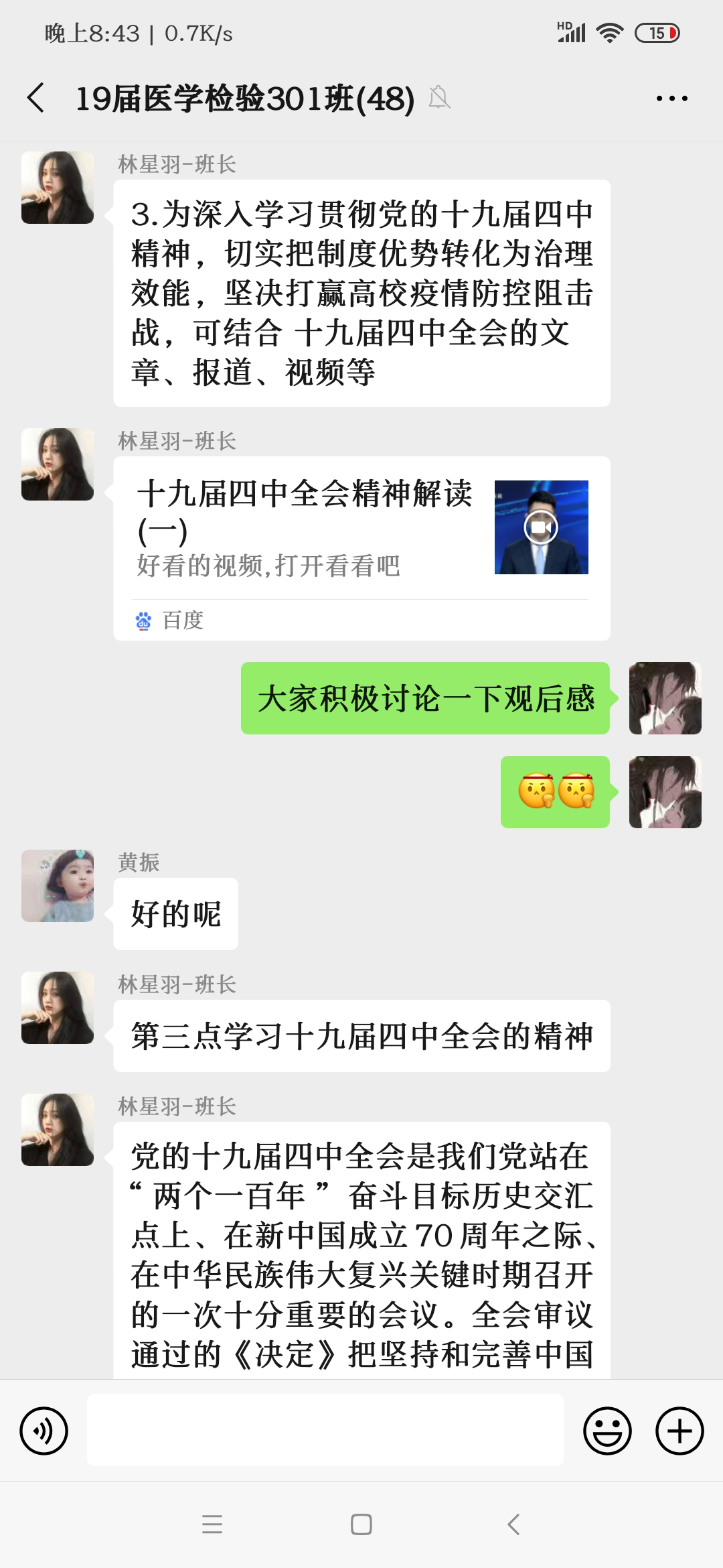 在各班团支书的带领下,全体团员在各班群签到,确认所有人都在线参与此次活动,并在线上齐唱国歌、团歌。各班团支书组织团员观看党的十九届四中全会精神的相关资料、视频和文章,同学们认真学习领会党的十九届四中全会精神,大家畅所欲言,纷纷发表对于党的十九届四中全会精神的心得体会。通过回答问题的形式,促进同学们对党的十九届四中全会精神的认识,为团日的结束划上了完美的句号。线上学习,做到理论学习“不断线”,凝聚起携手战疫的强大青春力量!