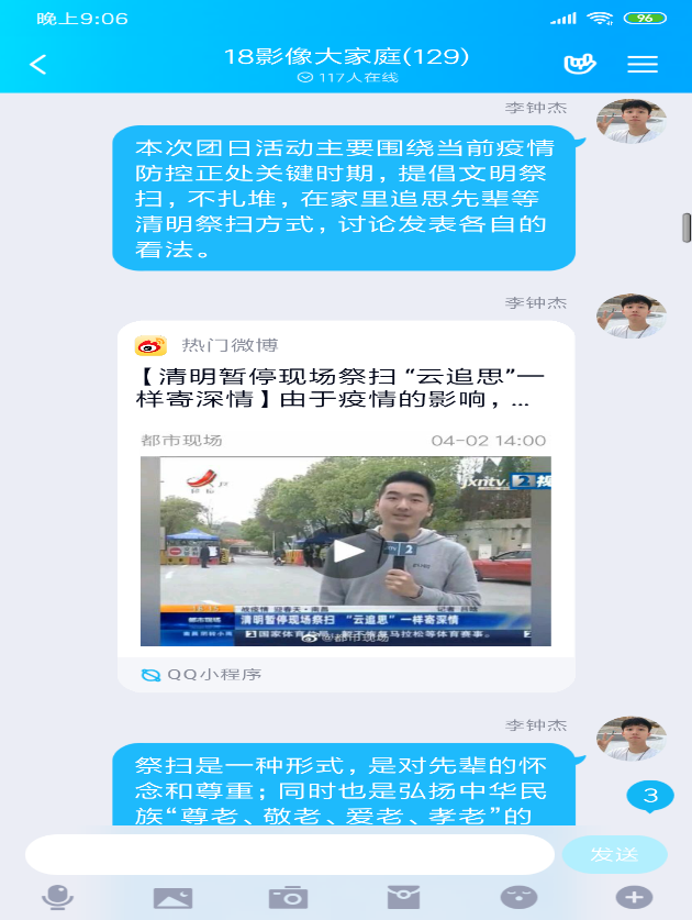 在全国上下众志成城、坚决打赢疫情防控人民阻击战之际,为铭记革命先烈,缅怀为战“疫”而牺牲的最美“逆行”者,传承中华民族传统文化,践行社会主义核心价值观,我系各班团支部于3月31日以QQ直播等方式开展以“网上祭英烈,防疫思英雄”为主题的团日活动,倡导同学们响应国家号召,开展“云”祭扫,做到“足不出户”瞻仰英雄烈士。
