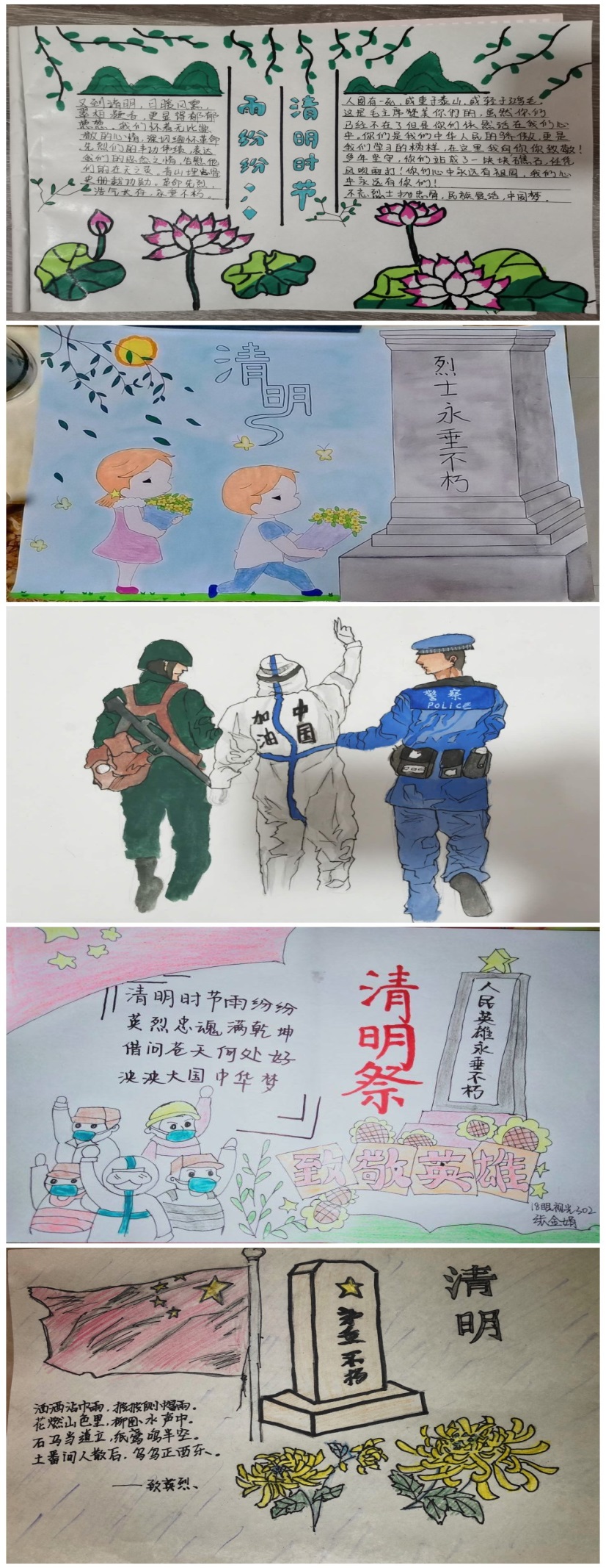 清明节是生者对逝者表达情感、倾诉衷肠的日子,也是启发生者珍惜生命、珍惜当下的重要契机。通过本次活动,同学们纷纷表示,我们在共同抗击疫情,悼念革命烈士,缅怀先烈丰功伟绩的同时,利用手中的画笔,向他们致敬;我们应感恩祖辈,学习先烈的英勇精神;我们都是一颗种子,可以让生命发扬光大。
