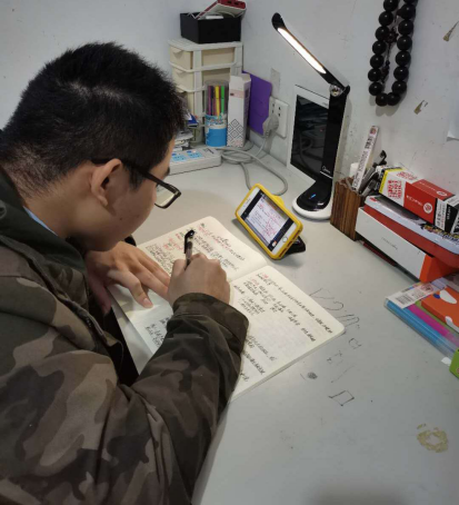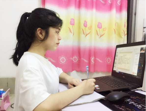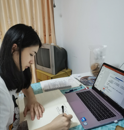 钟晓娜同学说:“在疫情如此严重的情况下也阻止不了我们学习的脚步。最近3个多月,由于疫情的原因,我们宅家学习。上网课就是通过软件在家直播。一台电脑,一部手机,一个笔记本,一支笔,怀着一颗求学的心开始学习。网课比起平常在学校学习需要更多自律,许多事情都需要靠自己自觉完成。希望在这次网课中,我们不仅能够学到新知识,还能做到自律,养成良好的学习习惯。”