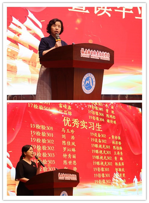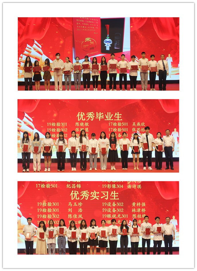 许能锋校长为毕业生代表颁发毕业证书和毕业纪念品。曾武祈书记为优秀毕业生、优秀实习生颁发荣誉证书。