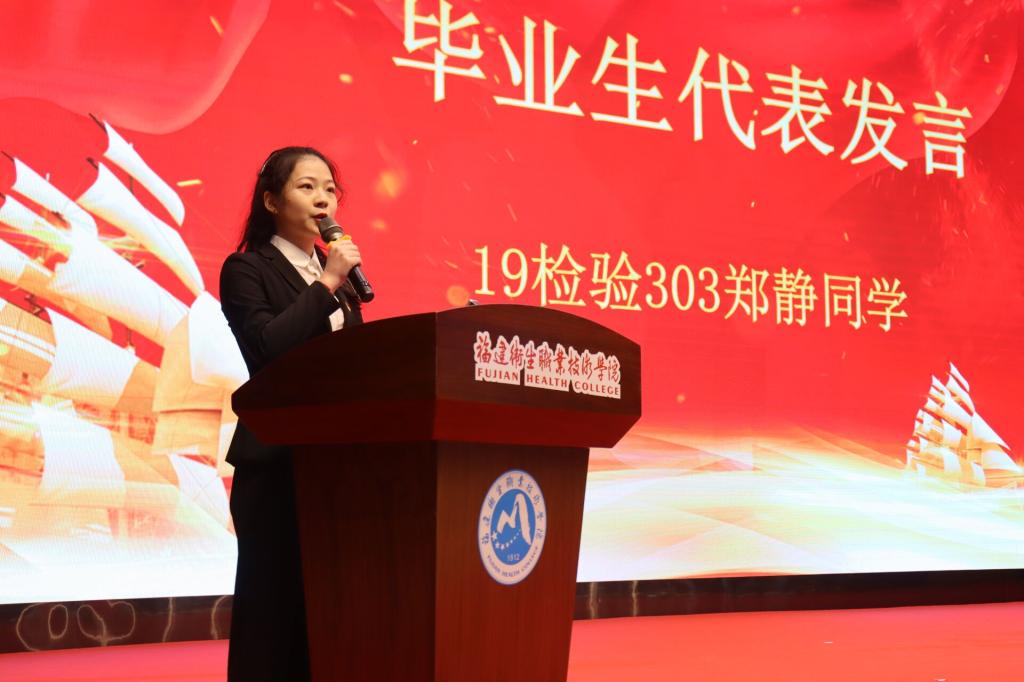 19检验303班郑静同学作为毕业生代表发言,她深情回忆了在闽卫院的美好时光,抒发了对母校和恩师的感恩和不舍,表达了医技学子奔赴一线基层,以实干奋斗服务健康中国的豪情壮志。