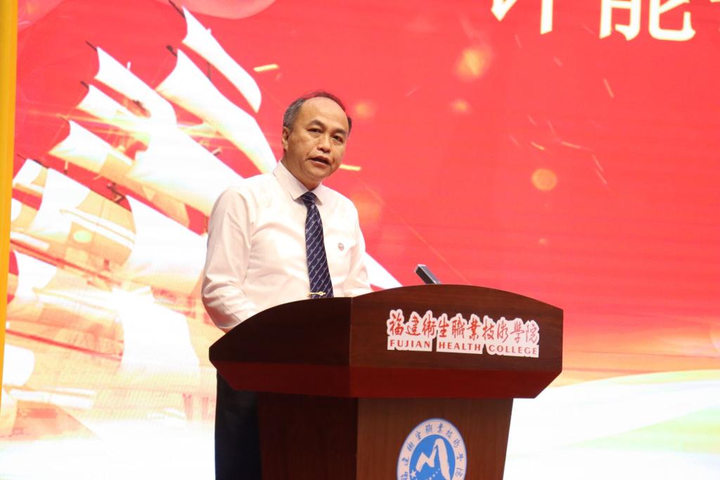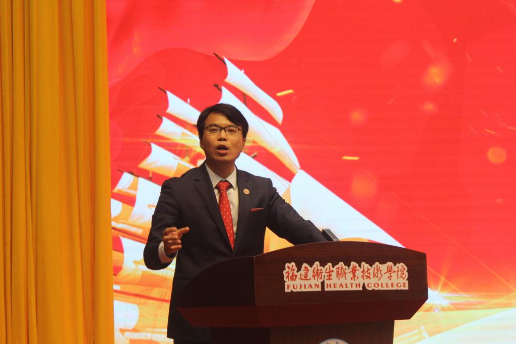 福建省肿瘤医院的带教老师陈超作为校企合作代表作了精彩发言,他深厚的国学底蕴和幽默风趣的语言魅力征服了在场师生,他勉励毕业生争做“专能、多能、全能”干细胞,耐得住寂寞,十年磨一剑力,在奋斗中沉淀实力,一鸣惊人。