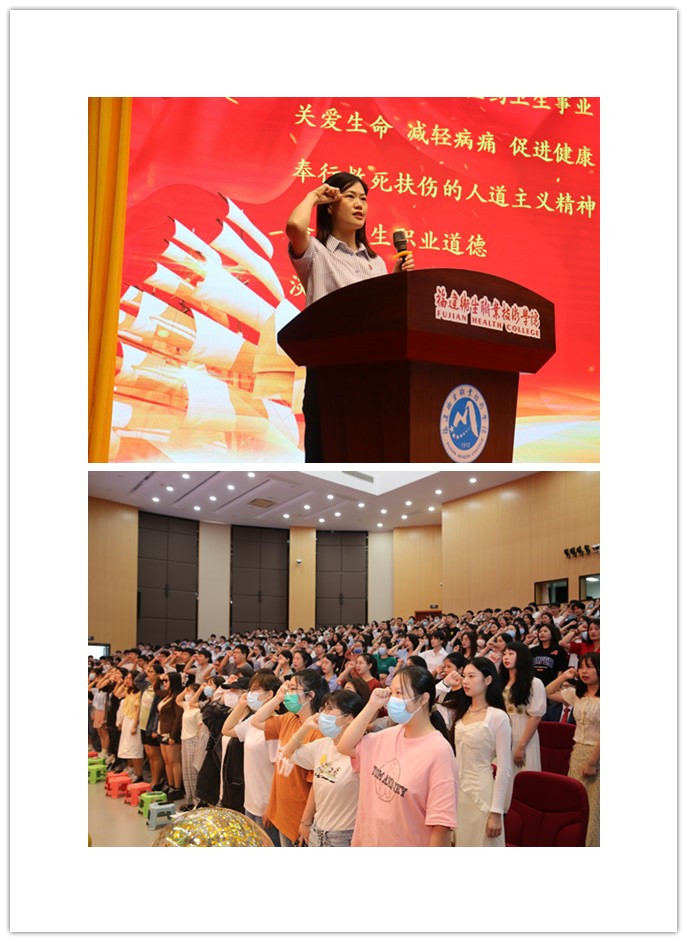 在2020年福建省职业院校教师教学能力比赛一等奖获得者雷娟娟老师领誓下,全体毕业生庄严进行毕业宣誓。“健康所系,性命相托……”一句句铿锵有力的誓词,回荡会场,激励师生们不忘初心,砥砺前行。