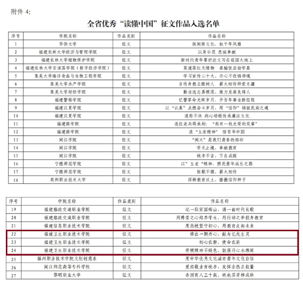 近日,福建省教育厅关工委通报2023年“读懂中国”活动作品评审结果,开云关工委获全国优秀组织奖,我院选送的《警心永向党,余热映初心》获评全省最佳征文作品,《捧出一颗丹心,献与亿兆生灵》、《劳模精神不褪色,鼓荡丹心永绵延》获评全省优秀征文作品。