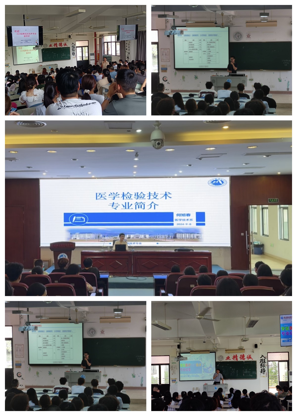 随后医工学院医学影像技术、医学检验技术、智能医疗装备技术、眼视光技术专业、医用电子仪器技术的专业带头人及相关骨干老师分别进行专业教育,他们以专业办学历史、人才培养模式、校企合作办学、课程体系、师资力量、实训条件、就业前景和学生技能水平等几个方面为新生做了详细的介绍,让新生对所学的专业有了全面的认识,展示了优良的办学条件以及深厚的教学底蕴,为新同学们融入新环境打下了良好的基础。