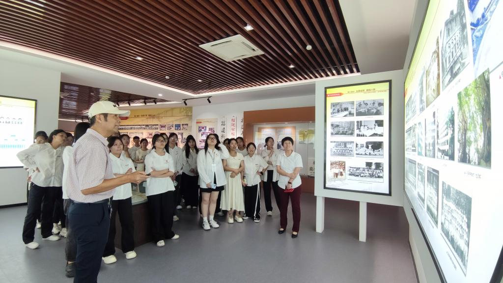 洪常青同志是学校1979级医学大专班校友、工会原专职副主席。在这位老校友亦是老教师的带领下,同学们参观校史馆“悠悠岁月,根深源远”、“沧桑巨变,崛起八闽”、“立德树人,风正帆悬”、“守正创新,建设示范”以及“不忘初心,行稳致远”五大展区。通过一桩桩学院大事记、一幅幅生动的历史照片,一件件鲜活的历史实物,同学们全方位了解学校办学的峥嵘历程,感受一代代闽卫人的接续奋斗,领略学校百余年校史的厚重底蕴。