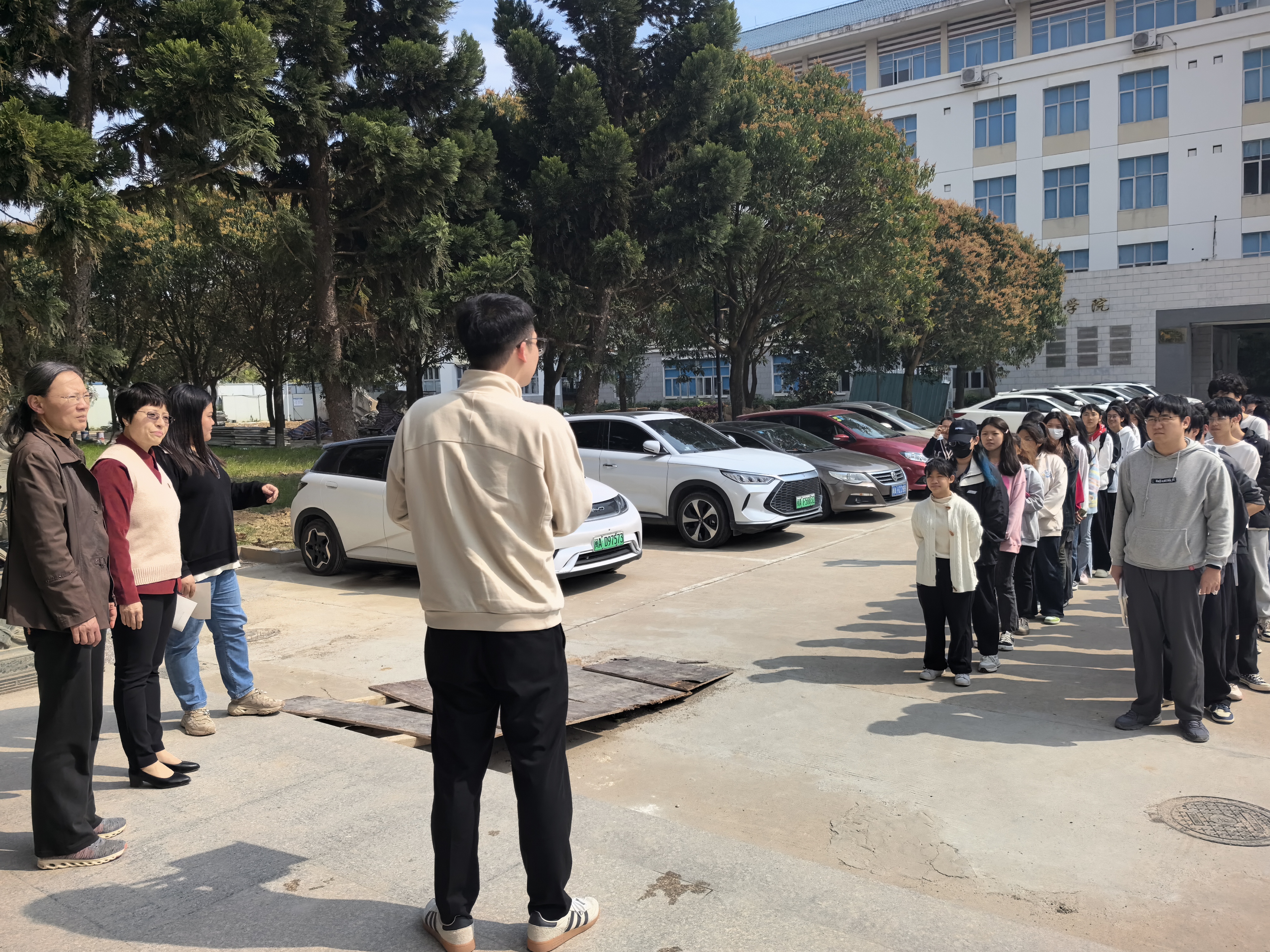 第二部分应急逃生演练(消防、地震)。演练开启前安全工作处林泽文先详细介绍消防器材的使用、演练程序、疏散信号、疏散路线、疏散顺序等注意事项,并强调在疏散过程中切勿拥挤、推搡导致踩踏事件发生。演练工作组接到演练指令后,燃放烟雾,平静的系部楼突然黄烟四起、警报铃响,各位老师迅速到达指定岗位,学生们也随之做出反应,在现场人员的指挥下,学生们纷纷用手、湿纸巾等捂住口鼻,弯着腰从预定的逃生路线进行撤离,撤退中所有同学紧靠右行,撤退过程井然有序,参加本次演练师生全部安全撤离到指定区域。