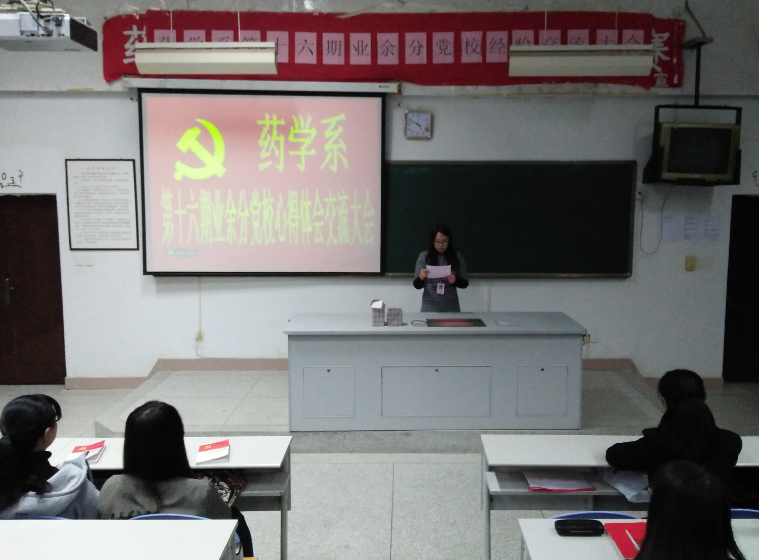 药学系第十六期业余分党校心得交流大会于2015年12月24日在药学系第二阶梯教室召开,出席此次心得交流大会的有团总支书记李宝珠老师,辅导员苏素娇老师和陈翰老师。 大会上,党课学员洪秋萍、苏成华、颜素婷、陈锦贤等四位同学作为代表发言,讲述了他们在党课上所学到的知识和感悟体会,并表示以后也会继续认真学习党课知识,坚定走社会主义道路的信念,不断完善自己,自觉践行自身的义务和责任,争取早日加入党组织。 最后由团总支书记李宝珠老师做重要总结,希望党课学员积极进取、努力学习,在思想和行动上能有更进一步的提高,做好模范带头作用,争取早日成为党组织中的一员。