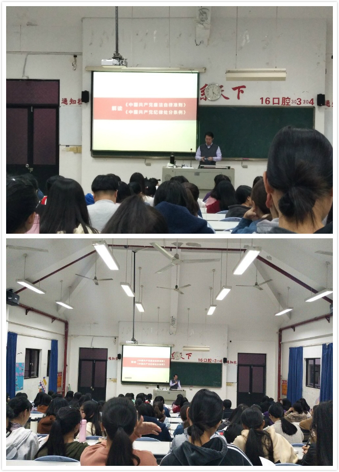 2017年12月5日,药学系第二党支部书记何舒澜老师在教学楼310为第二十期业余分党校学员们解读《中国共产党廉洁自律准则》和《中国共产党纪律处分条例》。