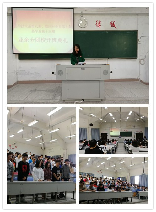为深入贯彻落实习近平总书记系列重要讲话精神,切实加强和改进高校共青团各项工作和建设,2018年4月19日,我系于医学技术系二阶召开药学系、医学技术系及临床医学系三系联办的业余团校开班典礼,莅临本次典礼的老师有:药学系团总支书记黄嵩梅老师、药学系团总支副书记尹德爱老师、医学技术系团总支书记黄玲云老师、医学技术系团总支副书记曾庆才老师、临床医学系团总支书记叶家涛老师、临床医学系团总支副书记谢林辉老师。参加此次团校的学员共九十余人,药学系参加团校学习共三十七人。