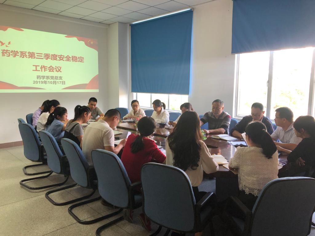 2019年10月17日,药学系党总支在系部会议室召开第三季度安全稳定工作会议。药学系党总支书记郑力宏、副主任(主持工作)肖健、党总支副书记赖文金、副主任潘雪丰、总支委员、各支部书记、教研室主任、实训中心主任及全体辅导员到场参会,会议由党总支书记郑力宏主持。