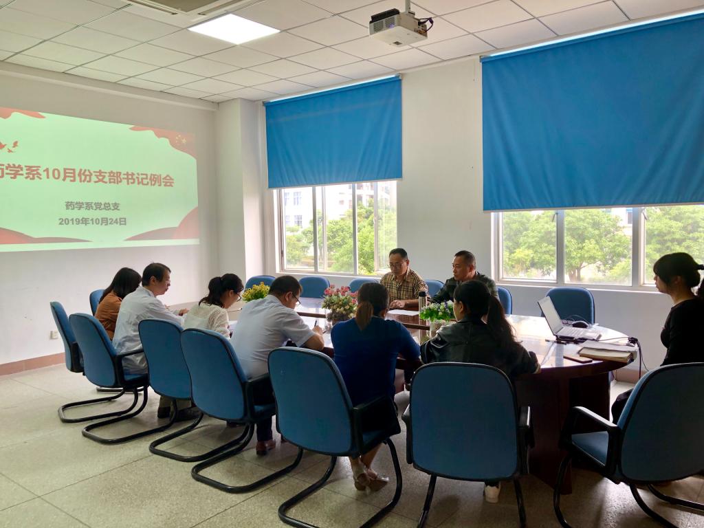 2019年10月24日,药学系党总支在会议室召开10月份支部书记例会,会议由药学系党总支书记郑力宏同志主持。