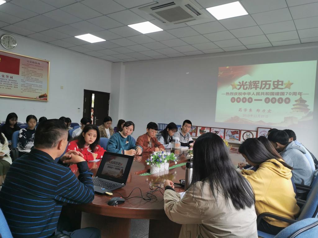 为热烈庆祝中华人民共和国成立70周年,2019年11月28日,药学系党总支郑力宏书记于我系会议室以“光辉历史”为主题,为18级团学干部讲授形势与政策课。