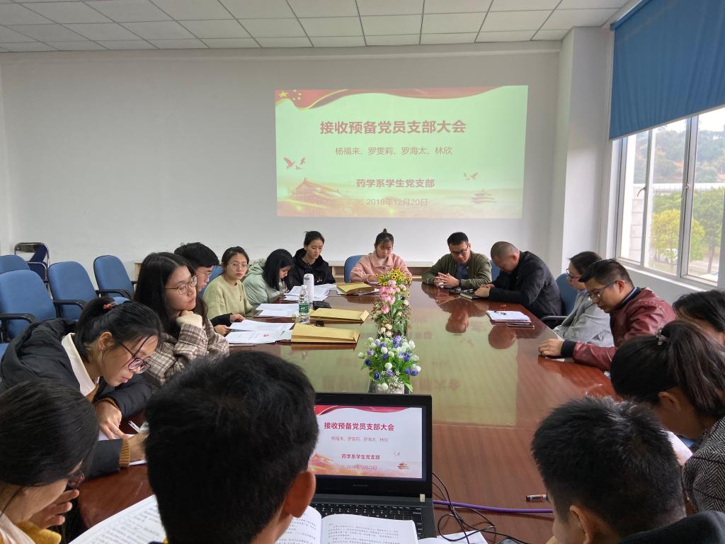 2019年12月20日下午,开云在线登录app入口药学系学生党支部于药学系207会议室召开接收预备党员大会,讨论关于杨福来、罗雯莉、罗海太、林欣等4名同志考察期满拟转中共预备党员事宜。大会由药学系学生党支部陈翰书记主持,药学系党总支赖文金副书记及各支部党员出席大会。