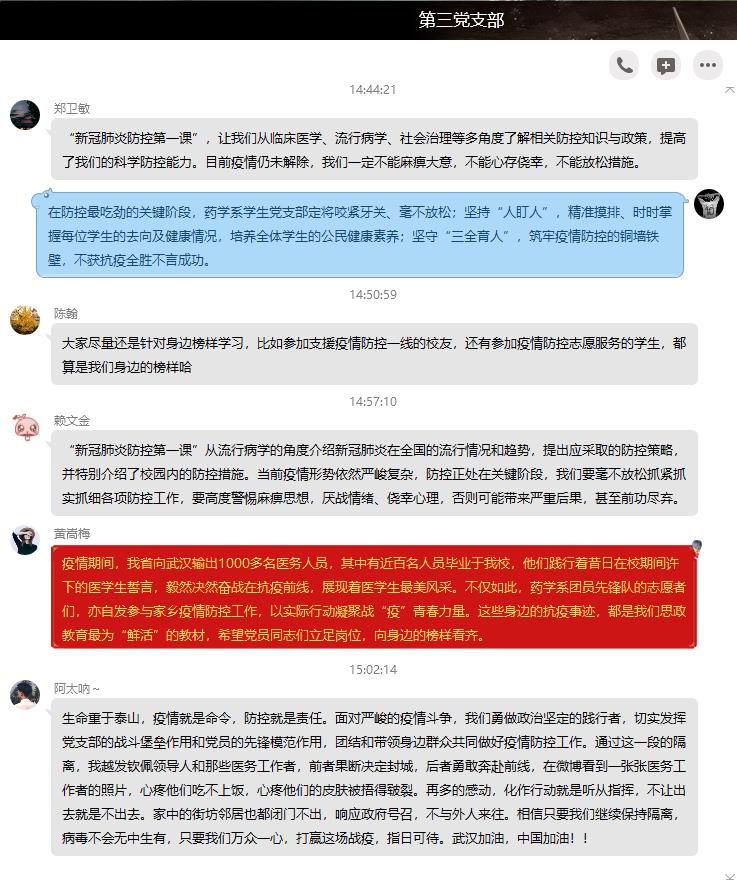 2月24日下午,就当日上午开讲的复旦大学“新冠肺炎防控第一课”,药学系学生党支部组织全体师生党员,通过QQ线上学习形式,集体学习防控重点、交流学习心得。