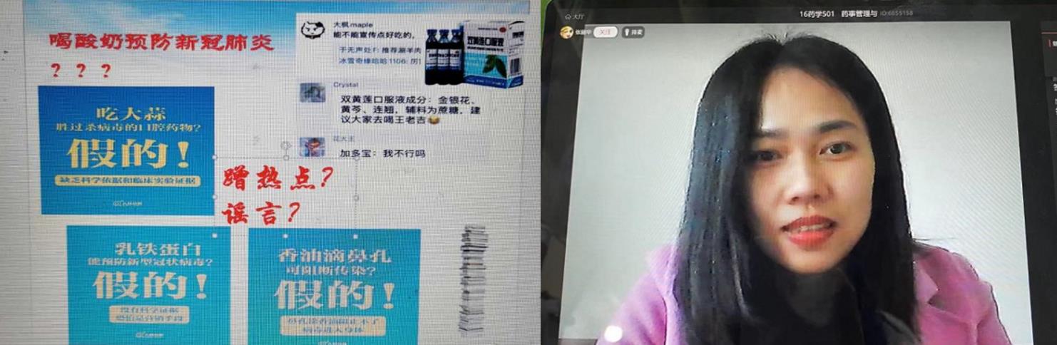 有了支部书记的带头,样板支部的党员和积极分子们纷纷摩拳擦掌,通过不同的专业课程各显神通。“在这次新冠肺炎的防治过程中,一度出现各种谣言,有的说吃大蒜可以预防新冠,有的说将香油滴入鼻腔可以预防新冠,更有甚者说喝酸奶就可以治疗新冠,面对五花八门的说法,面对国家全力以赴应对疫情,挽救人民群众生命的大环境,我们应该怎么做?“这是药学系第一党支部入党积极分子张丽华老师的一堂在线课,她正引导学生探讨新冠肺炎防范中普通民众应该持有的正确态度,学生们积极回复,课堂气氛十分热烈,大家纷纷表示,要以更坚定的信心、更顽强的意志、配合各级机构坚决把疫情扩散蔓延势头遏制住,坚决打赢疫情防控的人民战争、总体战、阻击战。
