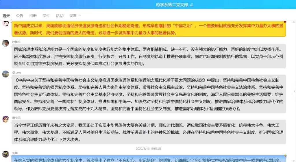 3月13日,为深入学习贯彻党的十九届四中全会精神,进一步做好疫情防控工作,药学系第二党支部通过微信群开展我学党的十九届四中全会线上主题党日活动。