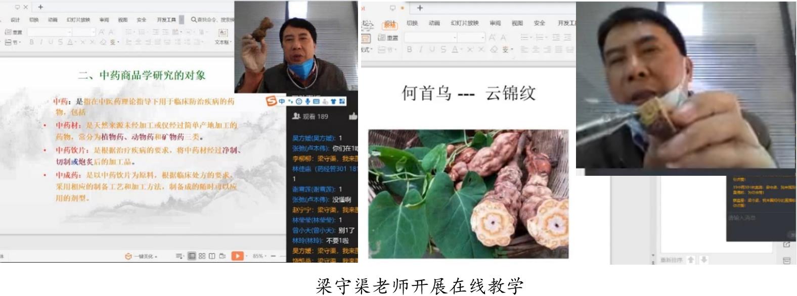 支部党员大多为专任教师,疫情期间的教学内容虽然和往常相差无几,可教师突然变身网络主播,教学场景较之先前发生较大变化,如何帮助他们做好在线教学的教学设计,进而保证在线教学的质量就成为本阶段支部的一项重要工作。为此,支委反复沟通,最后定下“直播平台与学习平台并用,课中直播为主,课前、课后学习平台辅助”的在线教学模式,引导支部党员选择合适的直播平台,根据不同课程的特点开展在线教学设计,注重在教学设计中融入疫情防控中的思政素材。《天然药物学基础与应用》课程团队非常重视预习环节的质量,针对每堂课的重要知识点他们都在课前精心录制若干小微课,讲清基础知识,提出问题,课中她们围绕问题通过直播开展提问、剖析、考核,教学环节的紧凑让学生不敢有丝毫懈怠。《中药商品学》课程团队则非常重视运用“实物标本的直观呈现辅以PPT中高清图片展示”的形式来帮助学生牢固准确地掌握中药商品的特征,而教学后学生向行业专家提问的积极踊跃则将良好的教学质量充分展现。支部党员将疫情防控中反映出的“文化自信”、“制度优势”、“家国情怀”等思政元素和丰富专业知识相互融合,如盐入水,诠释了药学系样板支部对优秀技能型人才培养的要求。