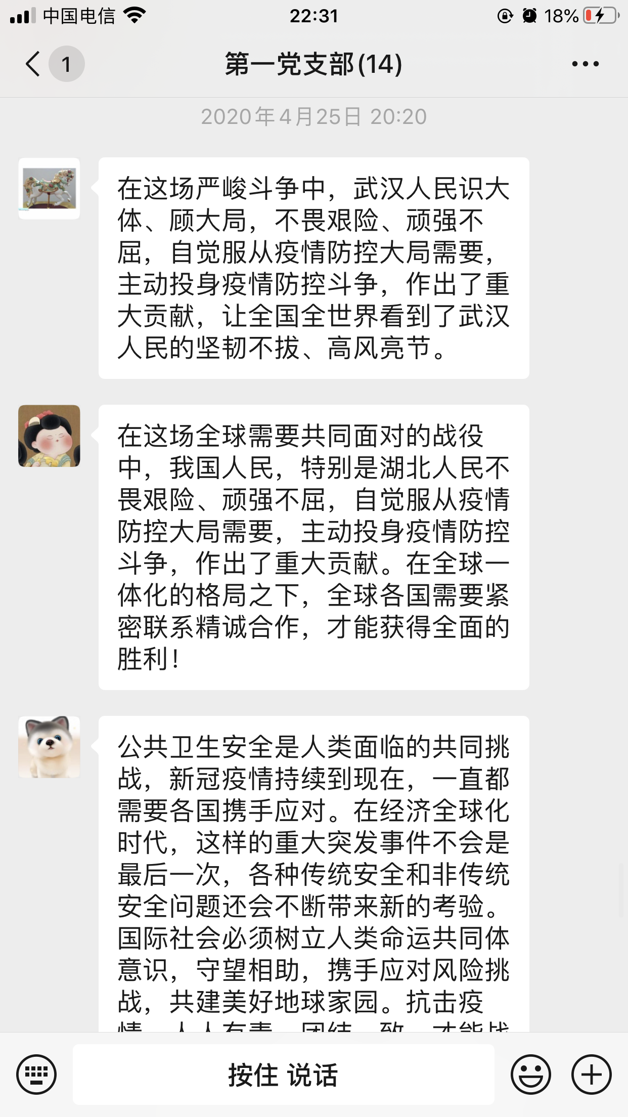 4月25日,药学系第一党支部通过微信平台,集中学习“习近平在湖北省考察新冠肺炎疫情防控工作时的讲话”、“习近平:团结合作是国际社会战胜疫情最有力武器”等内容,活动由支部书记何舒澜主持。