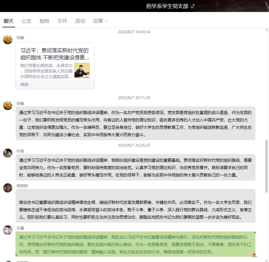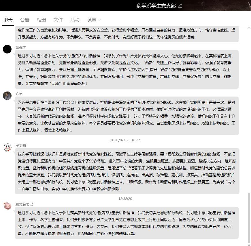 习近平总书记曾指出,“我们党要长期执政、永葆活力,团结带领全国各族人民沿着中国特色社会主义道路实现中华民族伟大复兴,最重要的是把党建设得更加坚强有力”。8月7日,药学系学生党支部通过QQ平台,集中学习习近平“贯彻落实新时代党的组织路线,不断把党建设得更加坚强有力”讲话精神,支部全体师生党员参与学习。