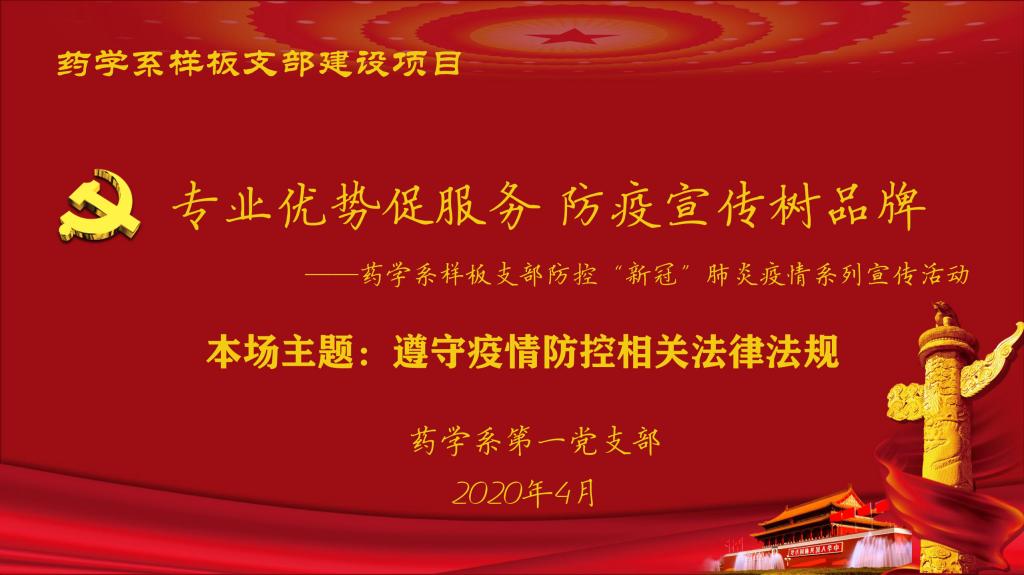 4月19日,药学系第一党支部开展线上“遵守疫情防控相关法律法规”防疫宣传主题党日活动,将志愿服务从线下转为线上,让服务永不“断线”。支部全体党员同志分为5个服务小组,通过网络平台为药学系一至三年级近500名学生开展疫情防控宣传。