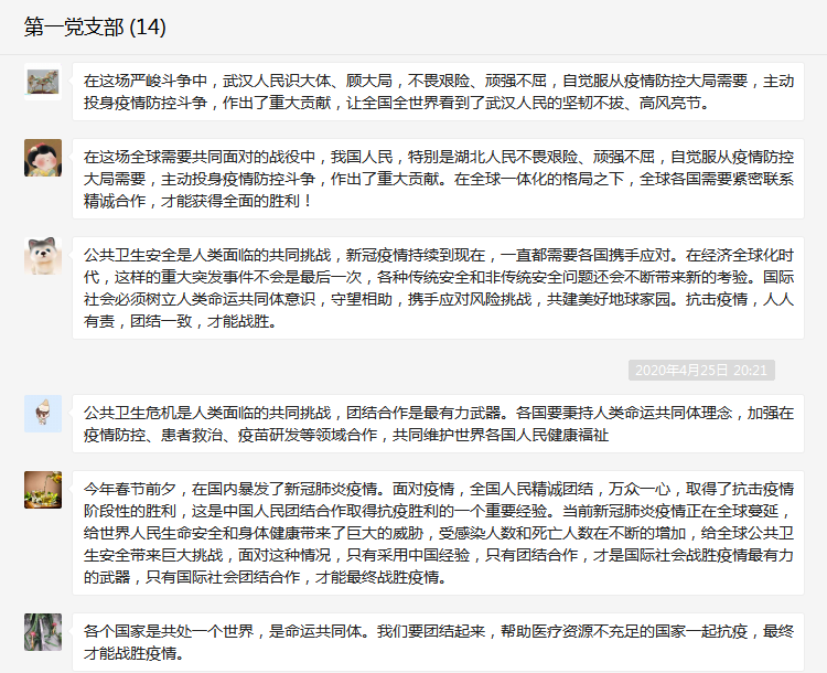 4月25日,药学系第一党支部通过微信在线学习习近平关于新冠疫情防控作出的重要讲话,即“习近平:在湖北省考察新冠肺炎疫情防控工作时的重要讲话”、“习近平:团结合作是国际社会战胜疫情最有力武器”,活动由支部书记何舒澜主持。
