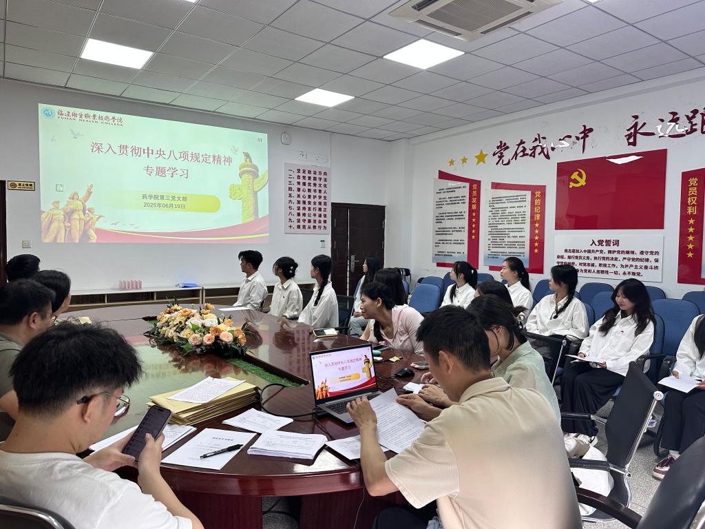 为深入贯彻中央八项规定精神学习教育,进一步加强党支部作风建设,提升党员干部的纪律意识和规矩意识,6月19日,药学院第三党支部组织全体党员开展深入贯彻中央八项规定精神学习教育第四次专题学习,重点学习了规定中的第六条 “改进新闻报道”和第七条 “严格文稿发表” 及相关实施细则的有关内容。
