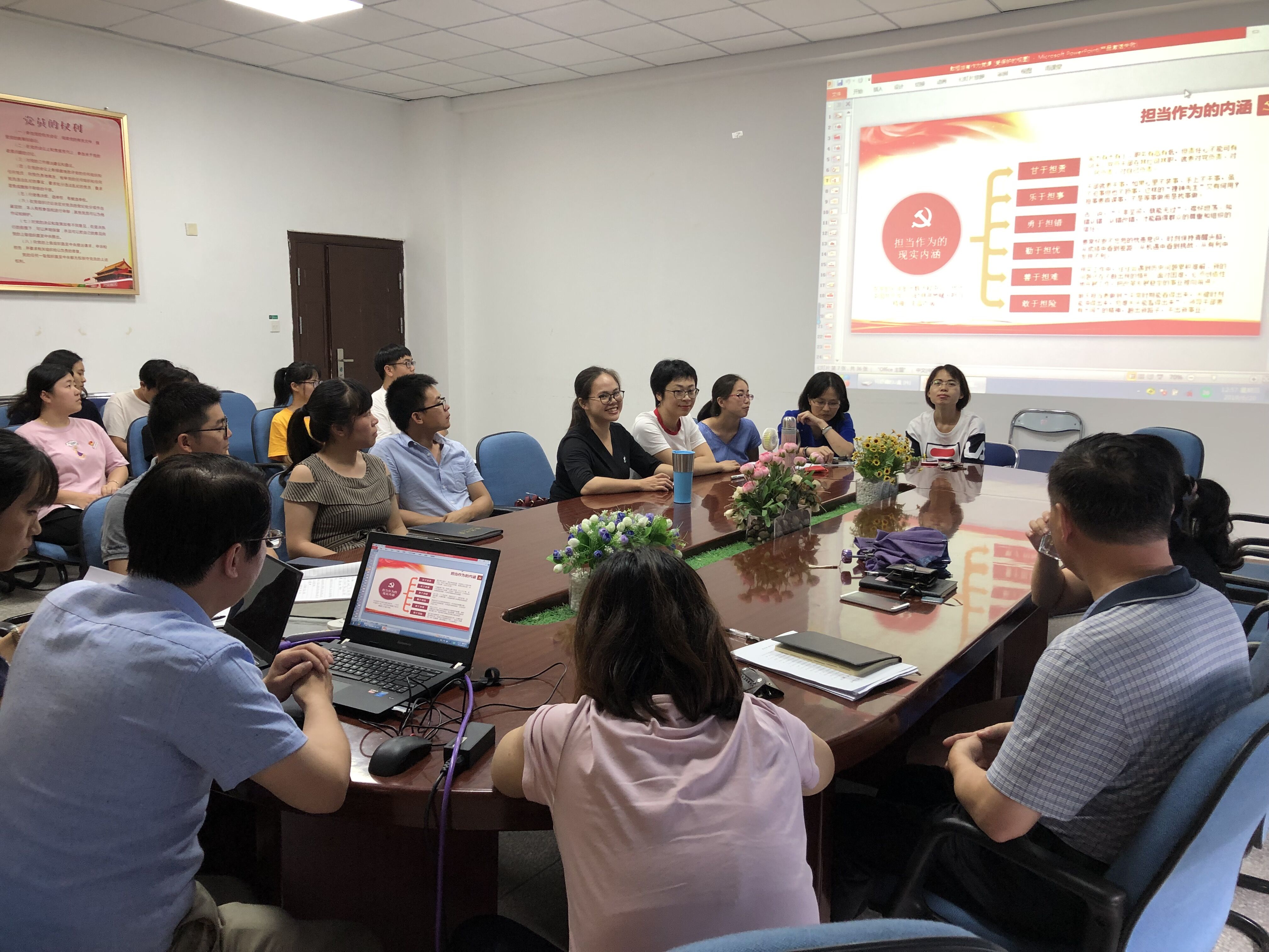 2019年6月20日,药学系第一党支部在药学系会议室举行了“敢担当有作为”主题党课教育活动,党支部书记何舒澜同志进行了宣讲,党支部十四名党员同志和九名预备党员参加了学习,活动由党支部组织委员陈钰主持。