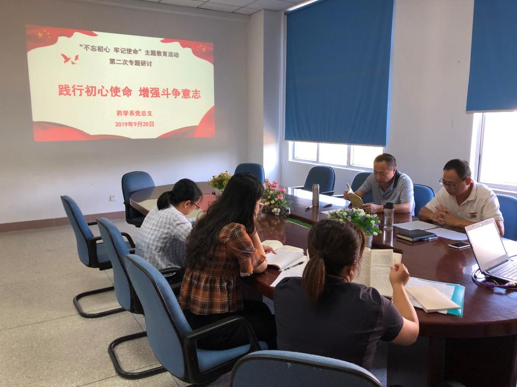 9月20日,药学系党总支在系部会议室开展主题为“践行初心使命,增强斗争意志”专题学习研讨交流会。药学系党总支书记郑力宏主持会议,系副主任(主持工作)肖健、党总支副书记赖文金、副主任潘雪丰参加了本次研讨交流会。