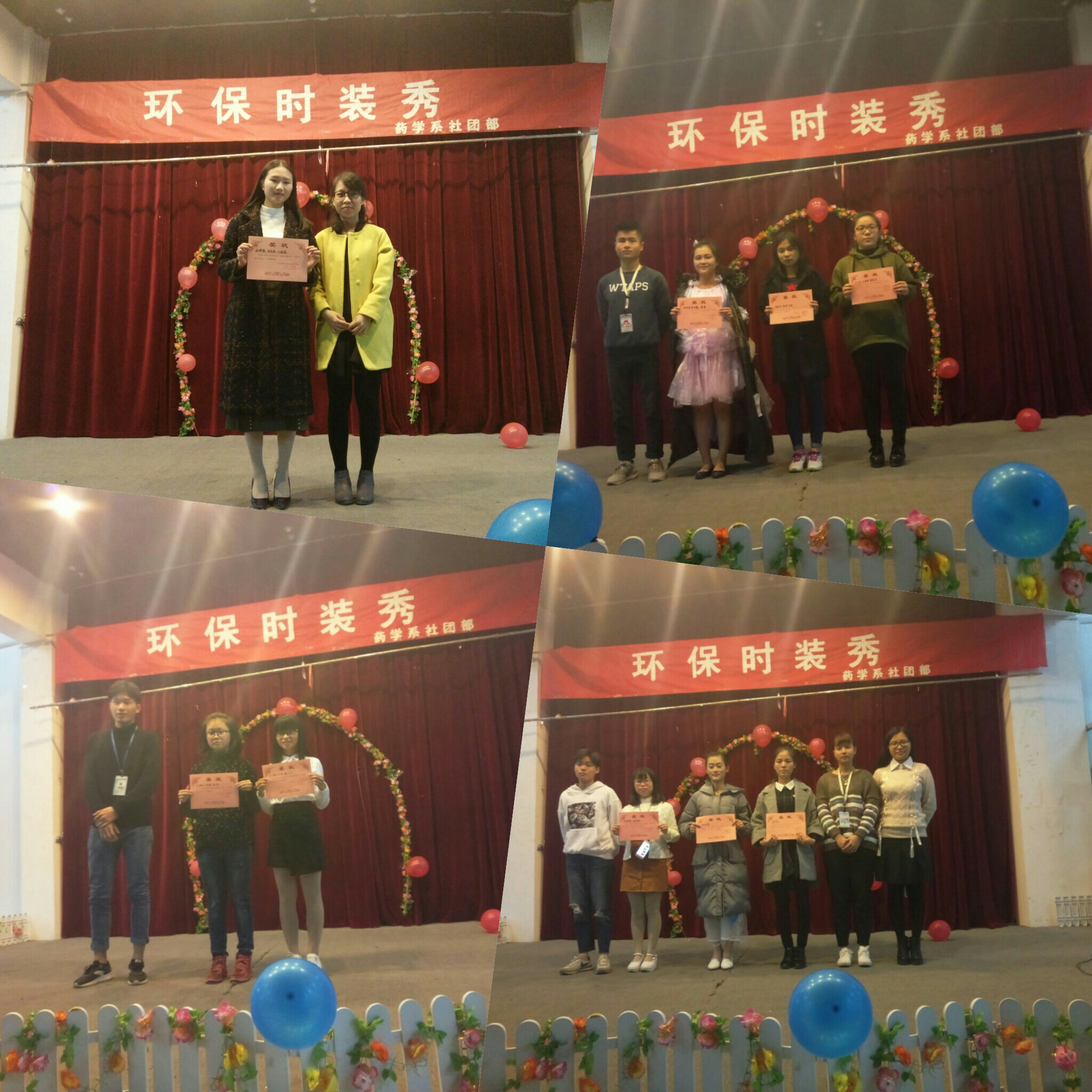 为进一步提高学生的实践能力和团队协作的意识,药学系学生会于2016年12月7日晚在明湖三楼举办“环保时装秀大赛”,本次活动邀请的评委嘉宾有药学系团总支副书记黄嵩梅老师,学生会主席林健辉,团副陈锦贤。活动面向全体药学系学生。 比赛共有18组参赛队,评委们从时装设计美观度、环保材料的创意使用度及模特的走台气质等方面对选手进行评判。参赛者用收集的废报纸、塑料袋、旧蚊帐等材料,发挥自己的想象力,制作出连衣裙、风衣、礼服、大侠服等精美别致的服装。其中来自15中药302班的“花狸猫”组合采用废弃的作业纸与海报纸相结合,在紧扣活动主题的前提下既不失活泼又彰显了个性,做出了美观大方的环保时装,受到现场观众和评委的一致好评荣获一等奖;16中药301“微光”组合及16药学306“放羊星星”组合荣获二等奖;16中药301“铭心”组合、16药学307“智慧果”、16药学301“绿箭低碳别动队”荣获三等奖。 此次比赛将“绿色”环保融入服饰艺术文化中,通过设计环保服装和舞台展示,增强了同学们的环保意识和创新能力。