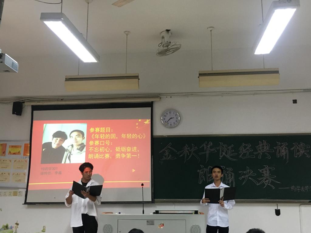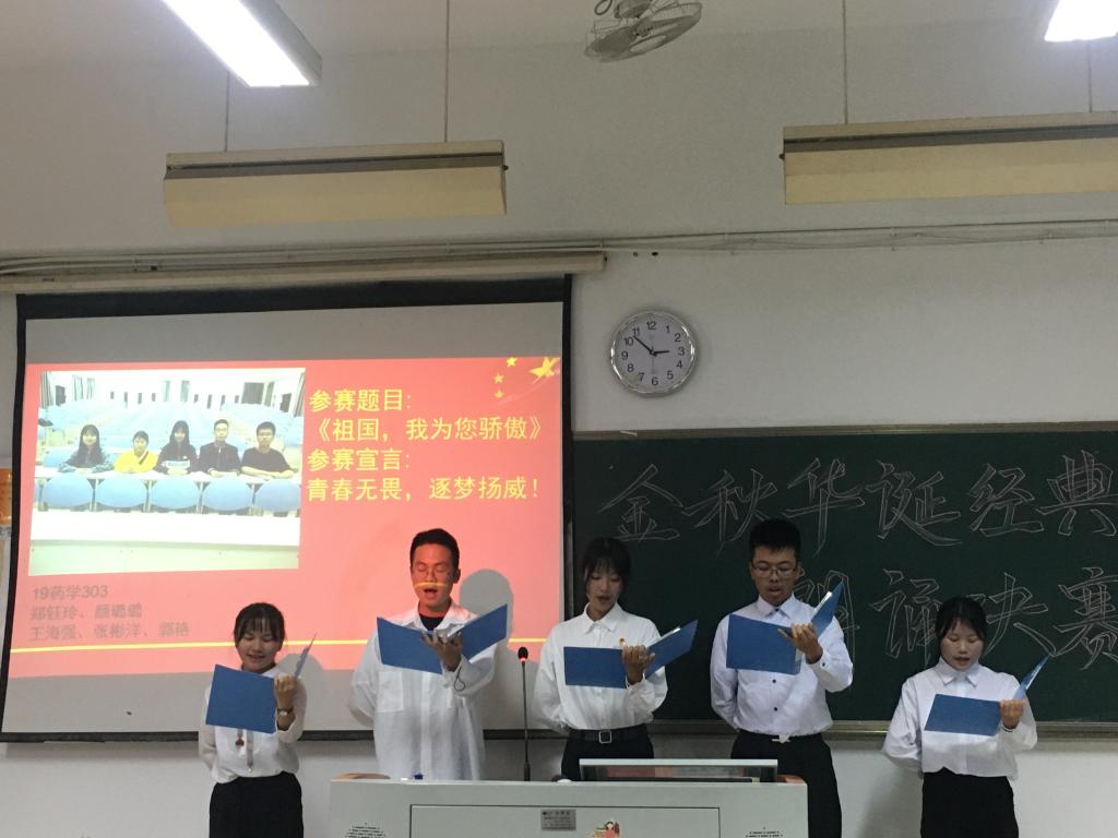 为进一步促进诗词朗诵艺术的发展,营造良好的校园人文气息,11月7日中午,药学系在教学楼315开展主题为“金秋华诞,经典诵读”的朗诵比赛,由学生会干部担任评委。