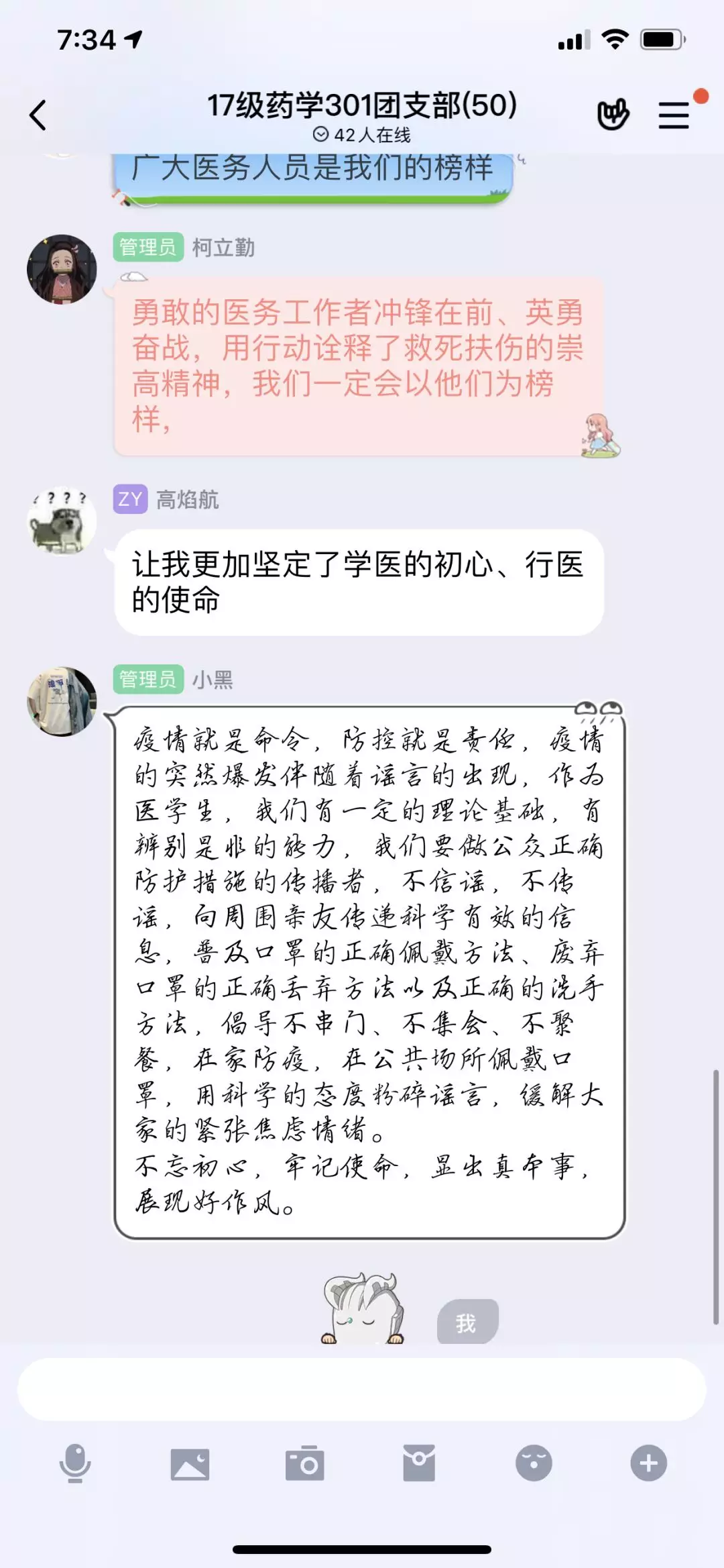 在这个特殊的时期,医务工作者发挥着极其重要的作用,冲锋前线的拼搏信念和日夜坚守的晶莹汗水,不断铸成白衣天使救死扶伤的崇高精神。习近平主席的这封信无疑是对医务工作者的肯定和鼓励,疫情防控期间我系团学干部就这封信展开了交流学习。系团总支也在第一时间组织各班级团支部通过线上学习贯彻习近平总书记重要回信精神,并分享学习心得。