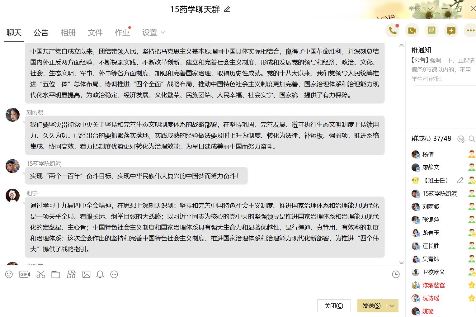 3月3日-5日,药学系辅导员组织全体学生通过线上学习形式,认真学习《中国共产党第十九届中央委员会第四次全体会议公报》,观看央视新闻视频和其他媒体对党的十九届四中全会内容的报道,并进行线上讨论、交流学习心得。