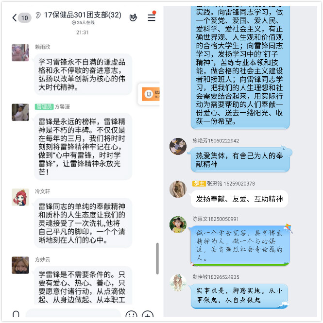 本次活动面向全系团员青年,共计42个团支部参与其中,各团支部围绕主题,依托QQ、微信等网络视频会议平台,分别以PPT解读、视频交流、诗朗诵、观看雷锋系列影片、问卷调查等多种形式展开。其中17药学302班团支部结合本次疫情,围绕雷锋精神,通过观看雷锋电影和纪录片,带领同学们加深对雷锋的理解;19药经管301班则通过PPT解读的形式和同学们分享雷锋同志的精神和事迹,引导同学们以实际行动讲好新时代雷锋故事。