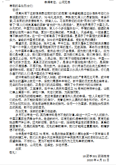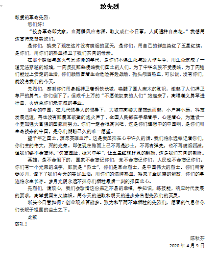 一封书信,铭记感动,传承信仰。本次活动的开展,使同学们深切感受到:幸福生活来之不易,当下的岁月静好,不过是总有英雄替我们负重前行!对英烈们最好的纪念就是传承,青少年要秉承英烈遗志,珍惜幸福生活,发奋图强,争做新时代的追梦人!