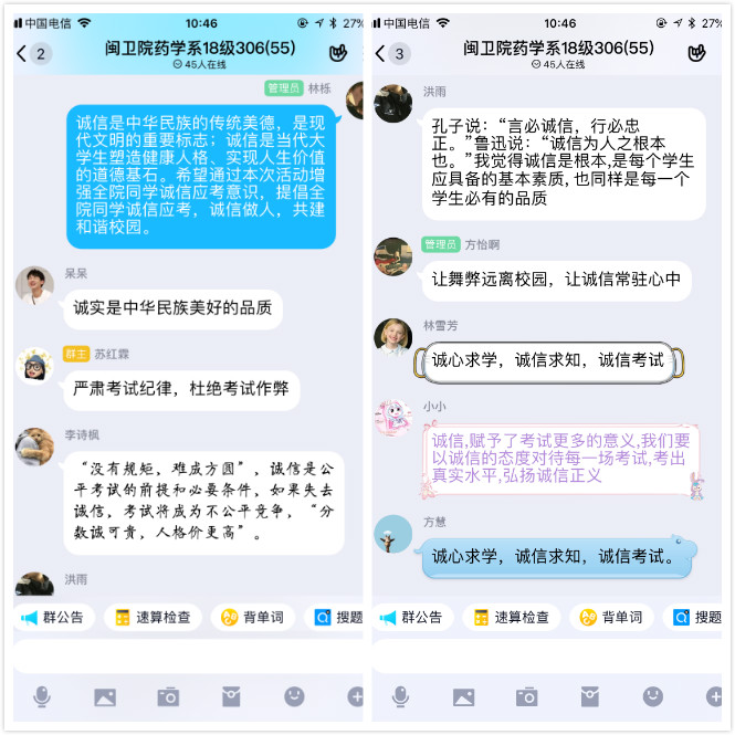 此次考试将采取线上考试形式,这是一次与众不同的期中考试,不仅考验同学们对知识的掌握程度,更考验同学们的诚信与初心。考试前期,各班辅导员围绕主题,依托QQ、微信、钉钉等方式,通过PPT演讲、在线交流等方式为同学们讲解如何正确、深入理解诚信,同时提出此次考试不同以往,需要同学们以诚信为本,做到自觉自律,并向同学们强调此次考试时间、考试方式及考试注意事项,希望大家认真准备,不打无准备之仗。辅导员老师的殷切关怀和谆谆教诲让全体学生备受鼓舞,纷纷表示即使身在家中,云端考试,也要做到“慎独”,心中有诚信,笔下有自律。
