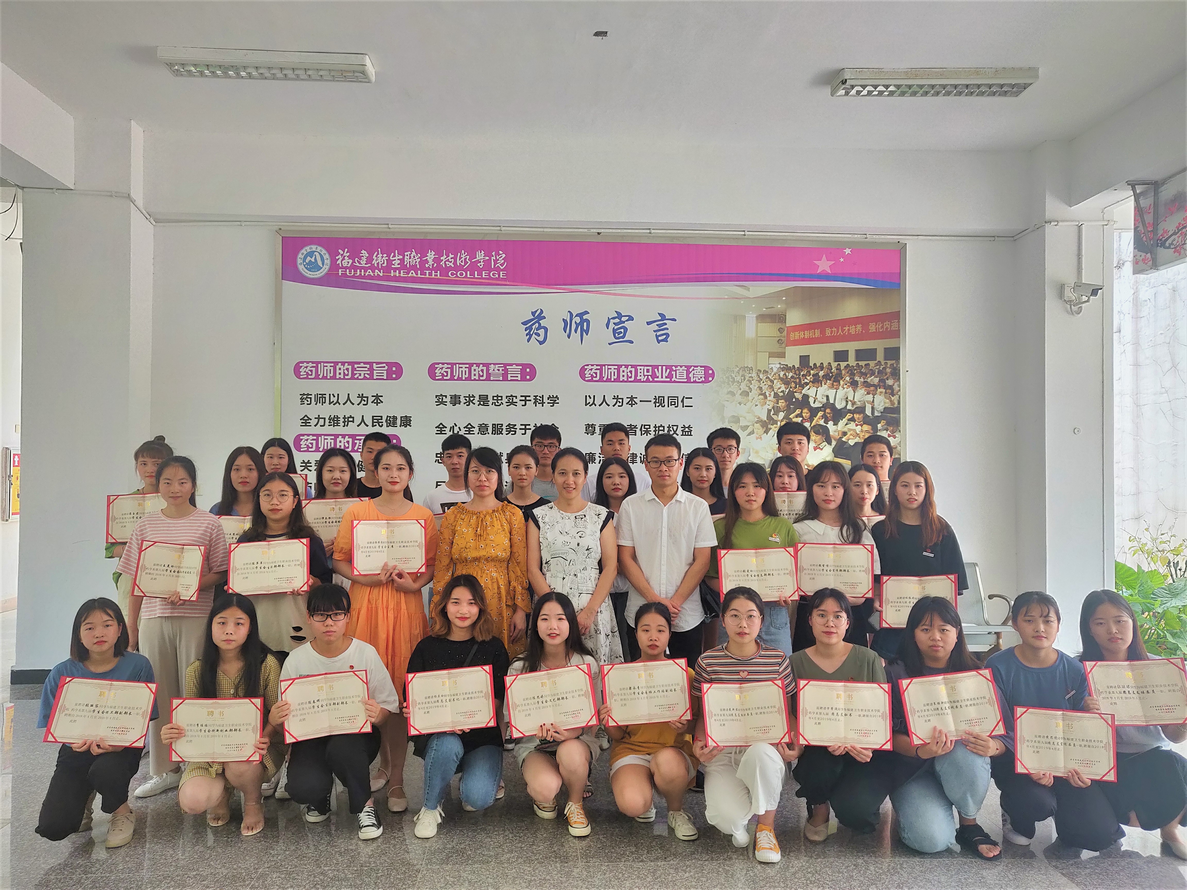 在2017级两委会学生即将踏上实习之际,为了感谢同学们一年来为系部建设辛勤的付出,2019年6月19日,药学系在207会议室召开2017级两委会聘书颁发仪式。药学系党总支副书记陈洁、专职组织员黄嵩梅、团总支副书记郑卫敏以及2017级两委会全体成员参加了此次仪式。