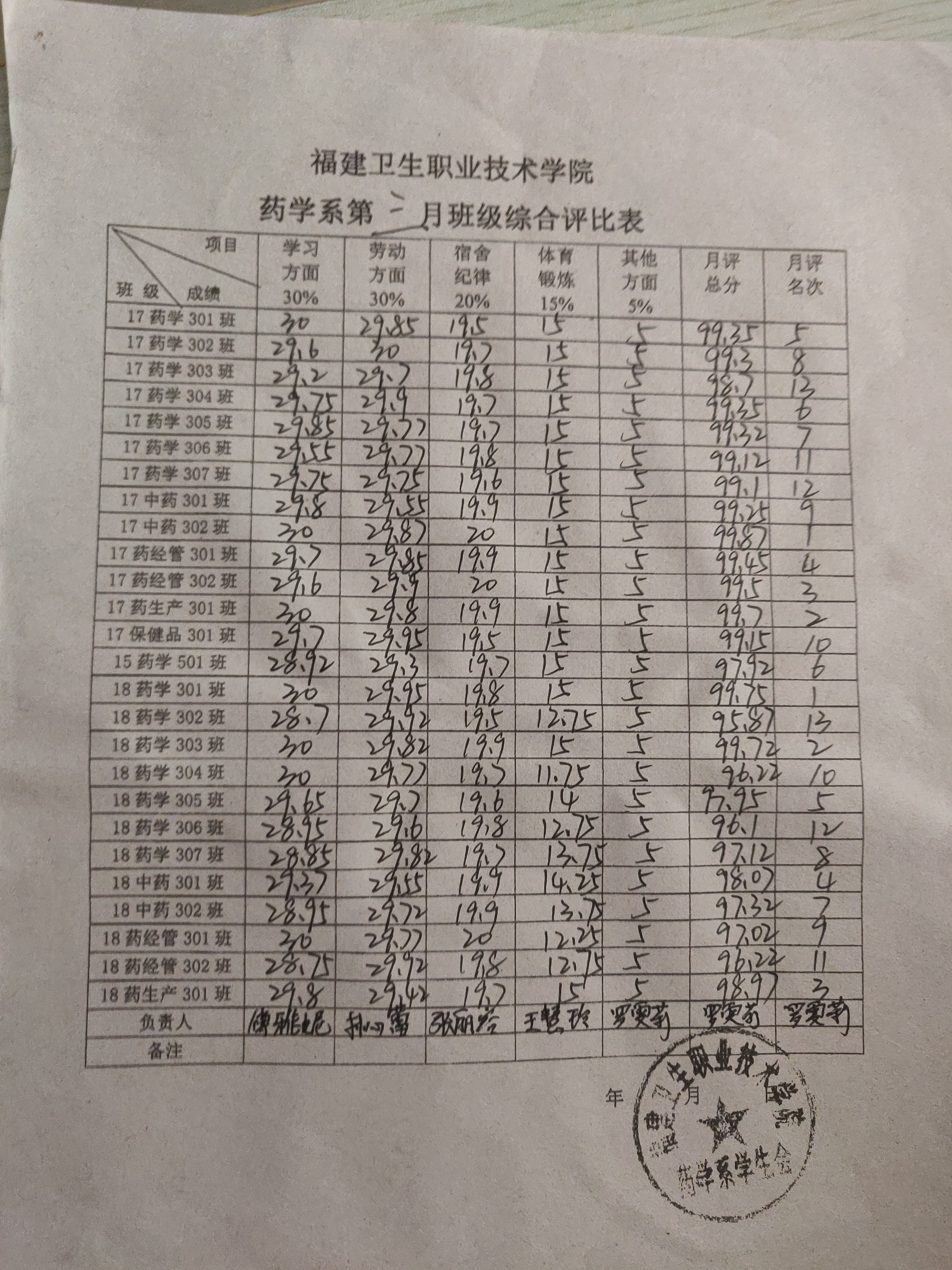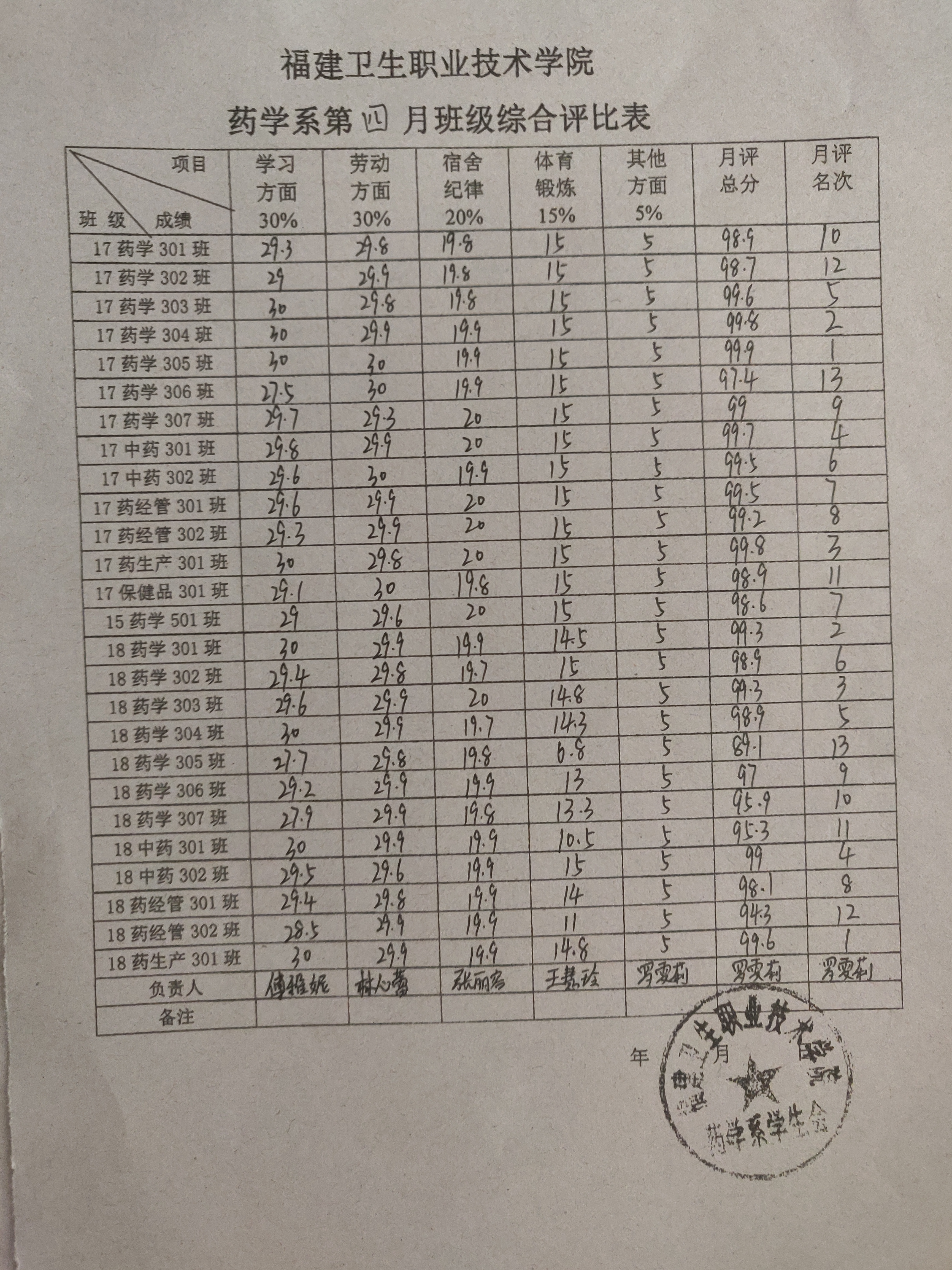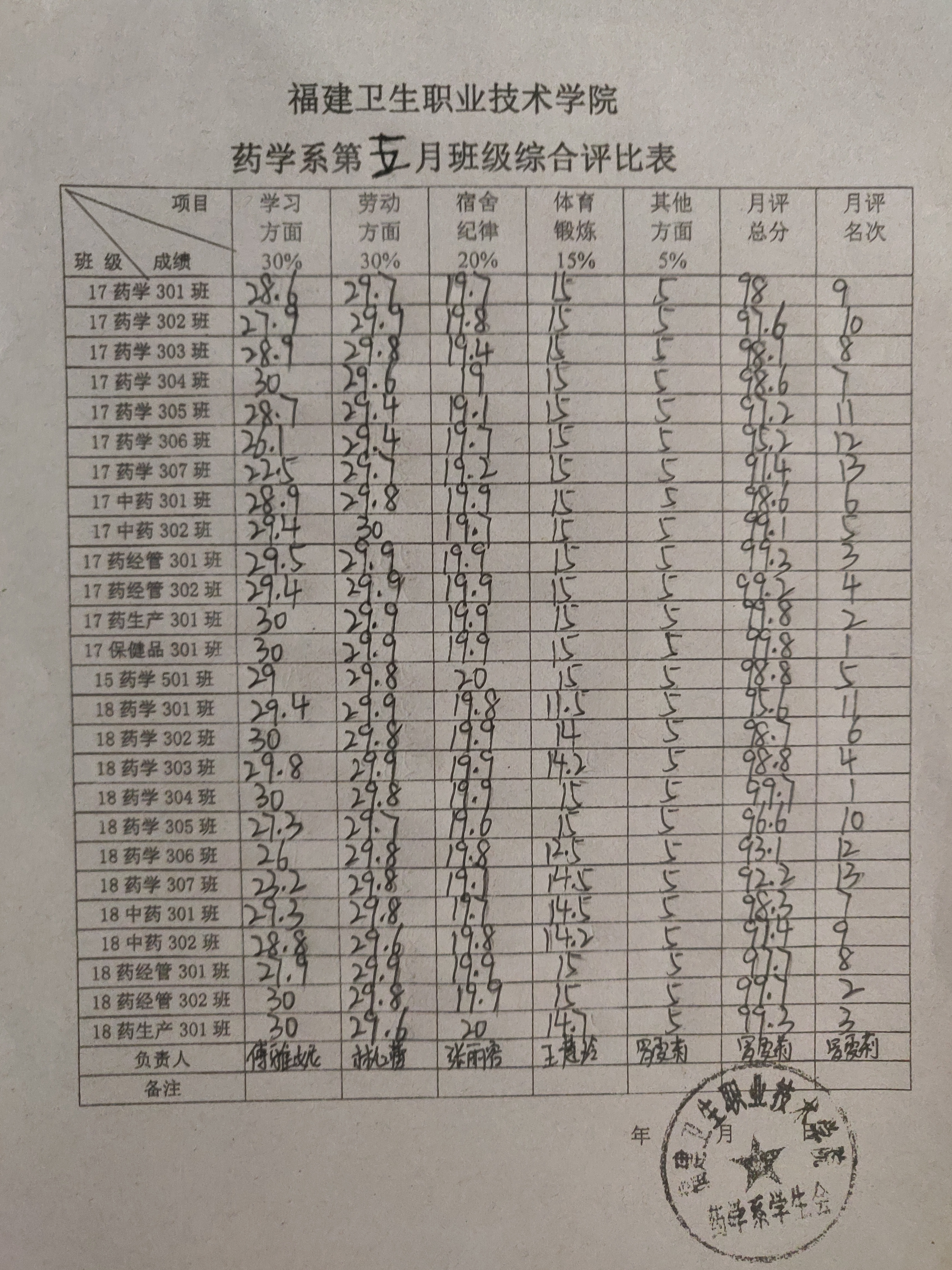 评比从学习情况、劳动情况、宿舍纪律、体育锻炼几个方面入手,依据各班的表现,对不合格的进行扣分,重点考核项目为各班级日常熄灯情况、教室和宿舍卫生状况、早操出勤率、晚自习出勤率。三月份第一名由17中药302班和18药学301班获得,第二名则由17药生产301班和18级药学303班这两个班级获得第二名,17药经管302班和18药生产301班两个班级获得第三名;四月份第一名由17级药学305班和18药产301班获得,第二名则由17药学304班和18药学301班这两个班级获得,17药产301班和18药学303班两个班级获得第三名;五月份17保健品301班和18药学304班表现最佳获得第一名,第二名则由17药生产301班和18药经管302班这两个班级获得,17药经管301班和18药生产301班两个班级获得第三名。