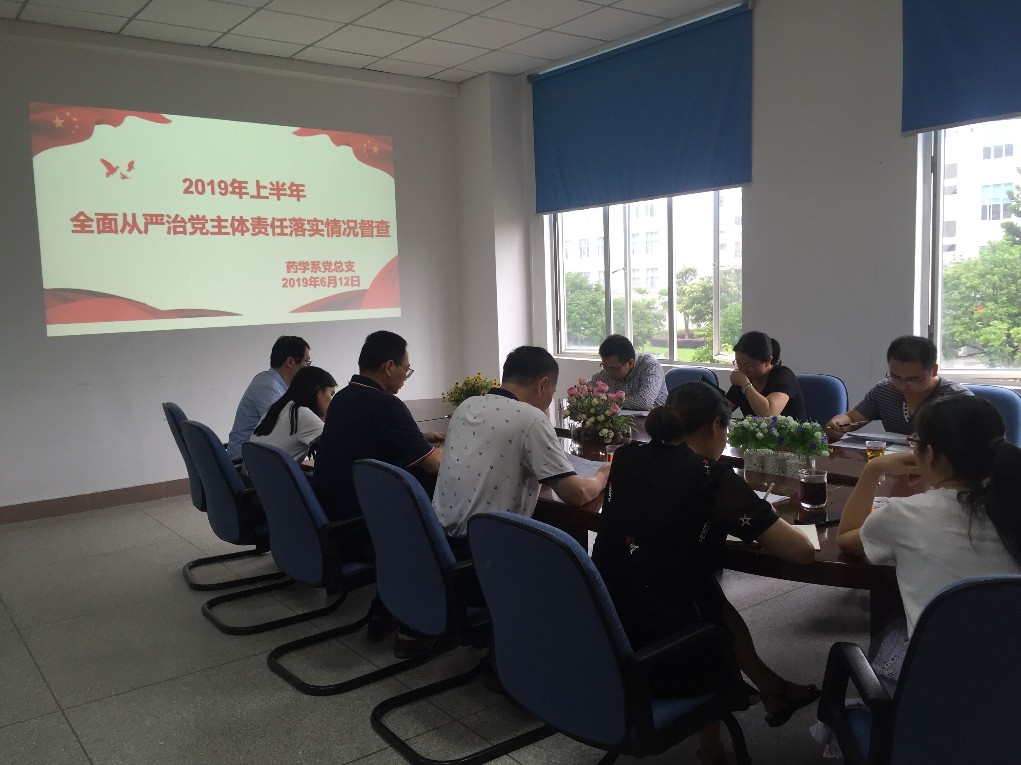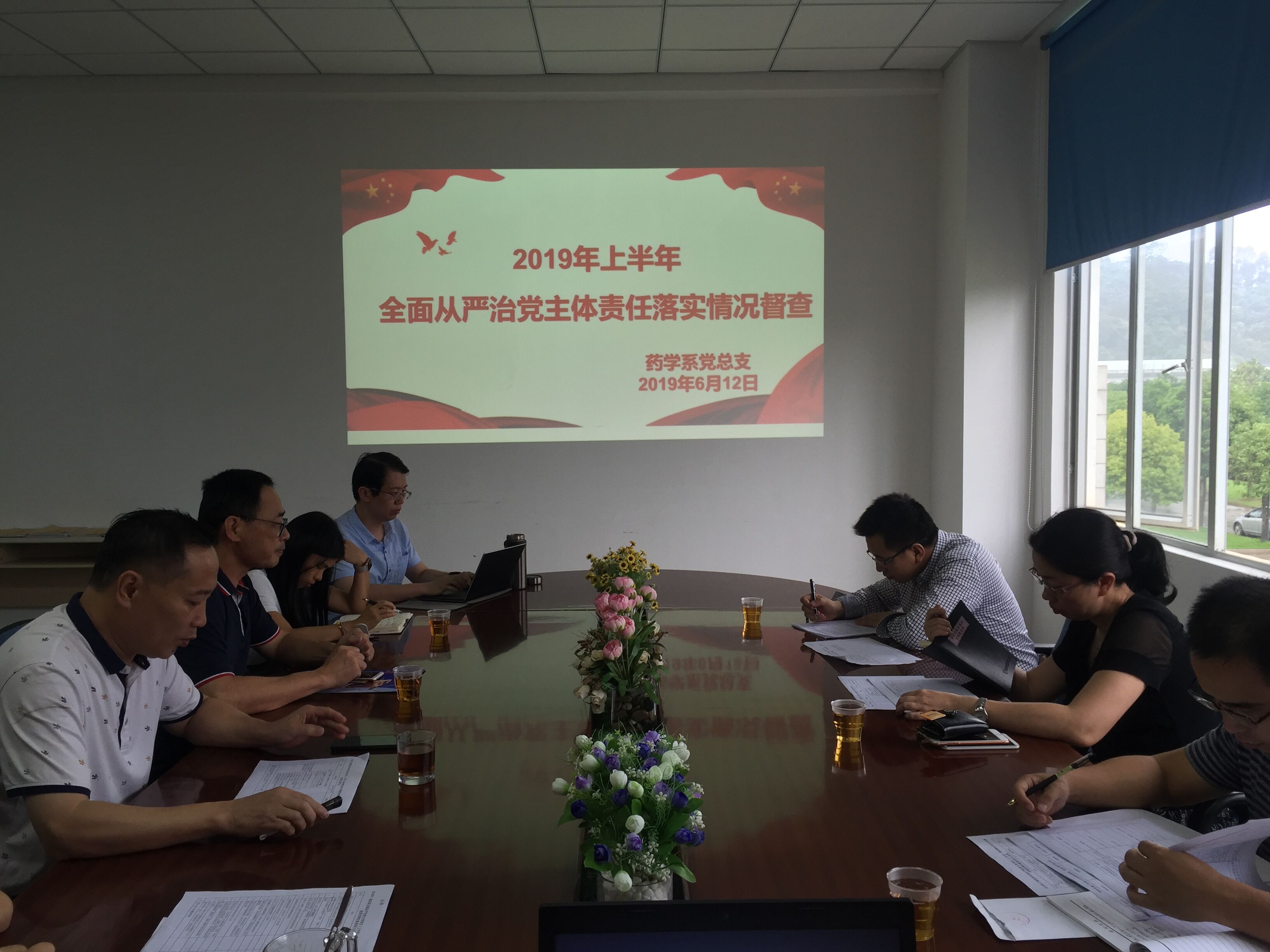 6月12日下午,学院黄铭珊副院长、党委工作部谢宗颖、临床系专职组织员叶家涛一行赴药学系开展2019年上半年全面从严治党主体责任落实情况督查,并于系部会议室召开自查情况汇报会,我系郑力宏书记、肖健副主任及党总支委员、各支部书记到场参加会议。