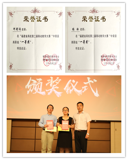 福建省移动教学大赛是福建省高等教育学会、福建省高校在线教育联盟为进一步推动我省高校在线开放课程建设与应用共享,促进信息技术与教育教学深度融合,提升高校教师信息化教学水平而组织开展的重要项目。本次福建省高校移动教学大赛于2018年10月开赛,历时半年,全省共有48所高校455个项目参赛,经过初赛、复赛,高职组最终评选出一等奖2项、二等奖4项、三等奖8项和优秀奖12项。