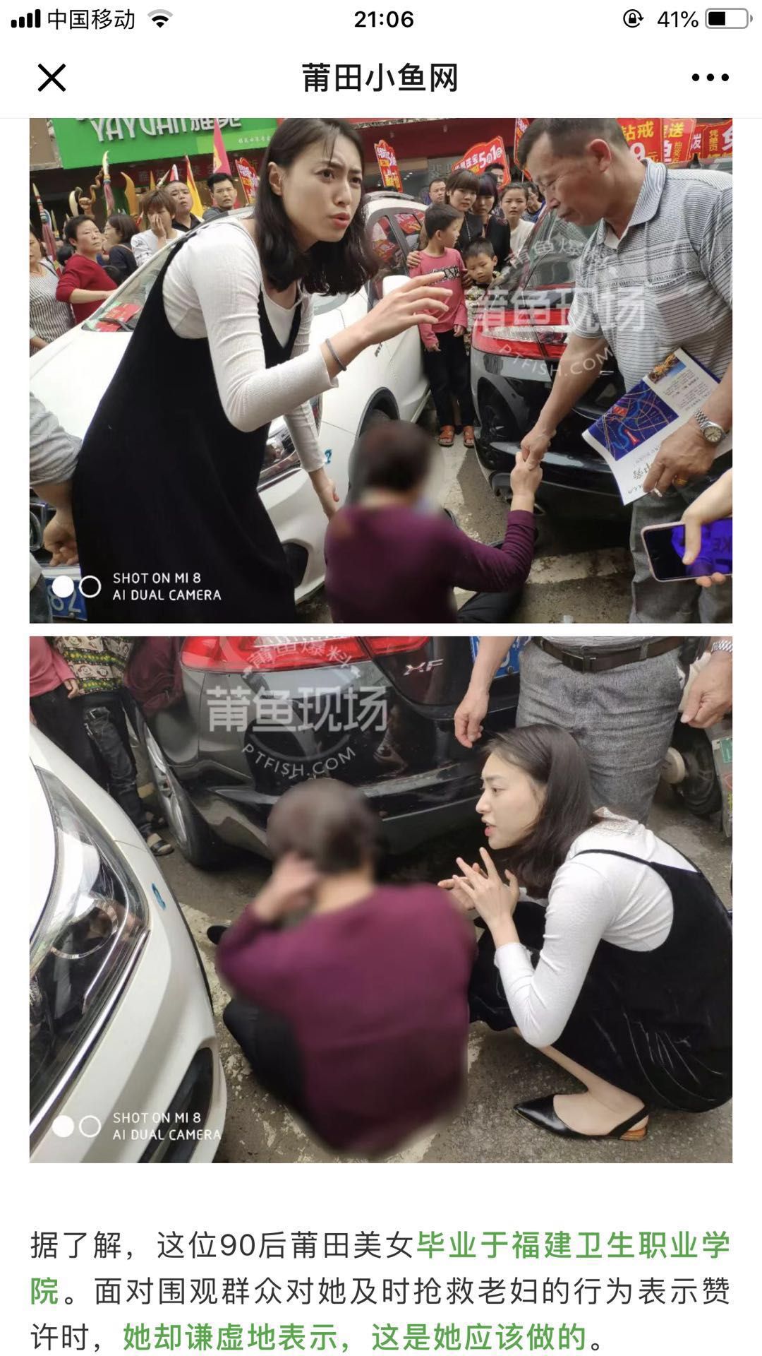4月20日下午,莆田黄石东井街举行盛大的民俗出游活动,吸引了大量市民围观,一位七旬老妇突发不适晕倒在地,正在众人束手无策之际,我系2017届毕业生蔡仕媚挺身而出,对老妇进行及时的抢救,并俯身为老妇喂水,直到老妇清醒方才离开。(莆田小鱼网的一则《谁认识这个莆田90后美女?全国网友都在找她…》的新闻刷爆了朋友圈)