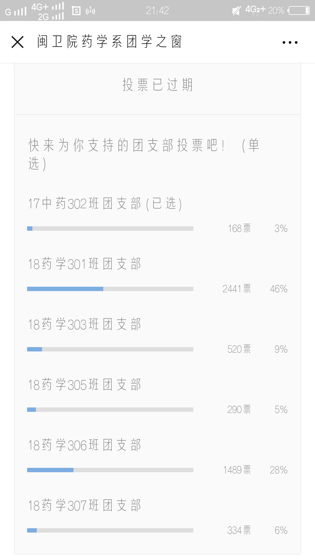 为更好地宣传此次团日活动,本次活动通过各班团支部提交的视频、报道稿质量共评选出了六个优秀团支部。并在此基础上,依托微信公众号平台,在平台上发起投票,各团支部参与其中,为期两天的网络投票,票数达5242票,阅读点击量达到7340次。最终,18药学306班团支部荣获一等奖和最佳人气团支部称号;二等奖由18药学301班团支部和18药学307班团支部获得;另外三个团支部分获三等奖,它们分别是:17中药302班团支部、18药学303班团支部、18药学305班团支部。
