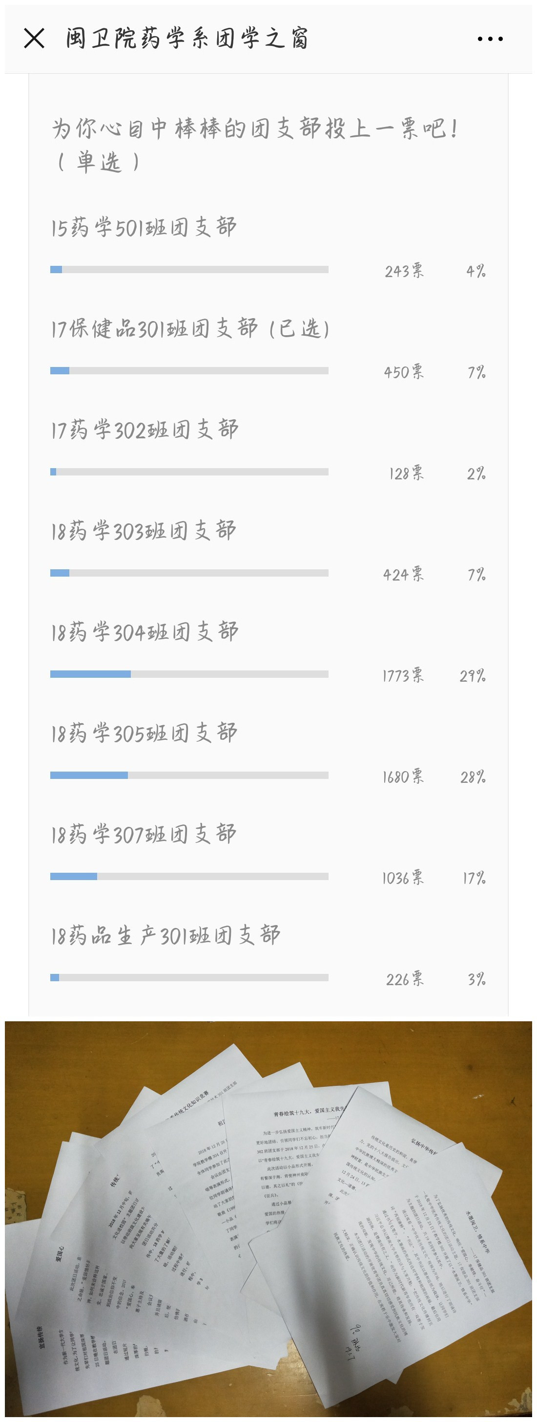 为了更好地宣传此次团日活动,本次活动通过各班团支部提交的视频、报道稿质量共评选出了八个优秀团支部。并在此基础上,依托微信公众号平台,在平台上发起投票,各团支部积极参与其中,为期两天的网络投票,票数达5960票,阅读点击量达7402次。最终,18药学304团支部荣获一等奖和最佳人气团支部称号;二等奖由18药学307团支部和18药学303团支部获得;另有五个团支部分获三等奖,它们分别是:17保健品301团支部、17药学302团支部、18药品生产301团支部、18药学305团支部和15药学501团支部。