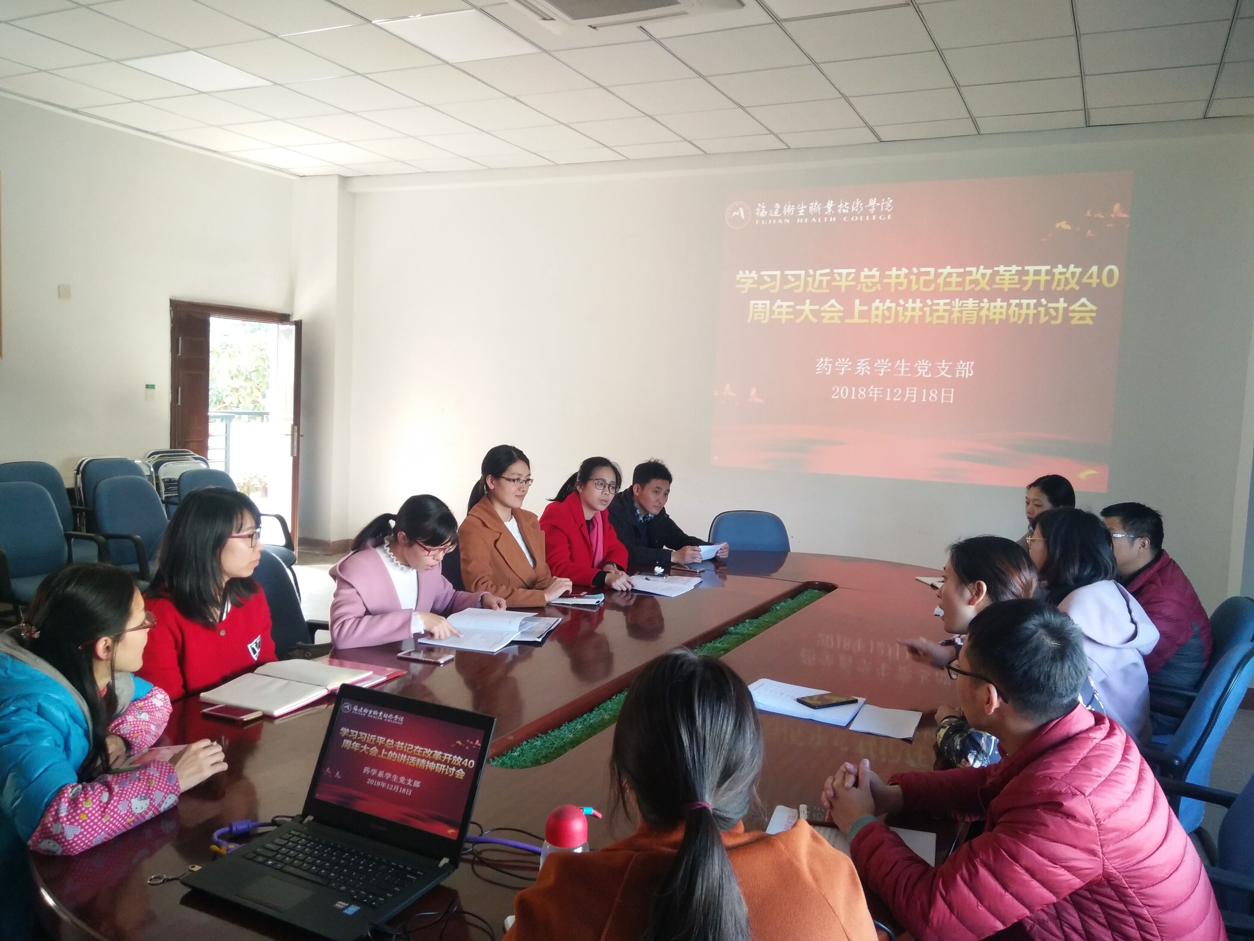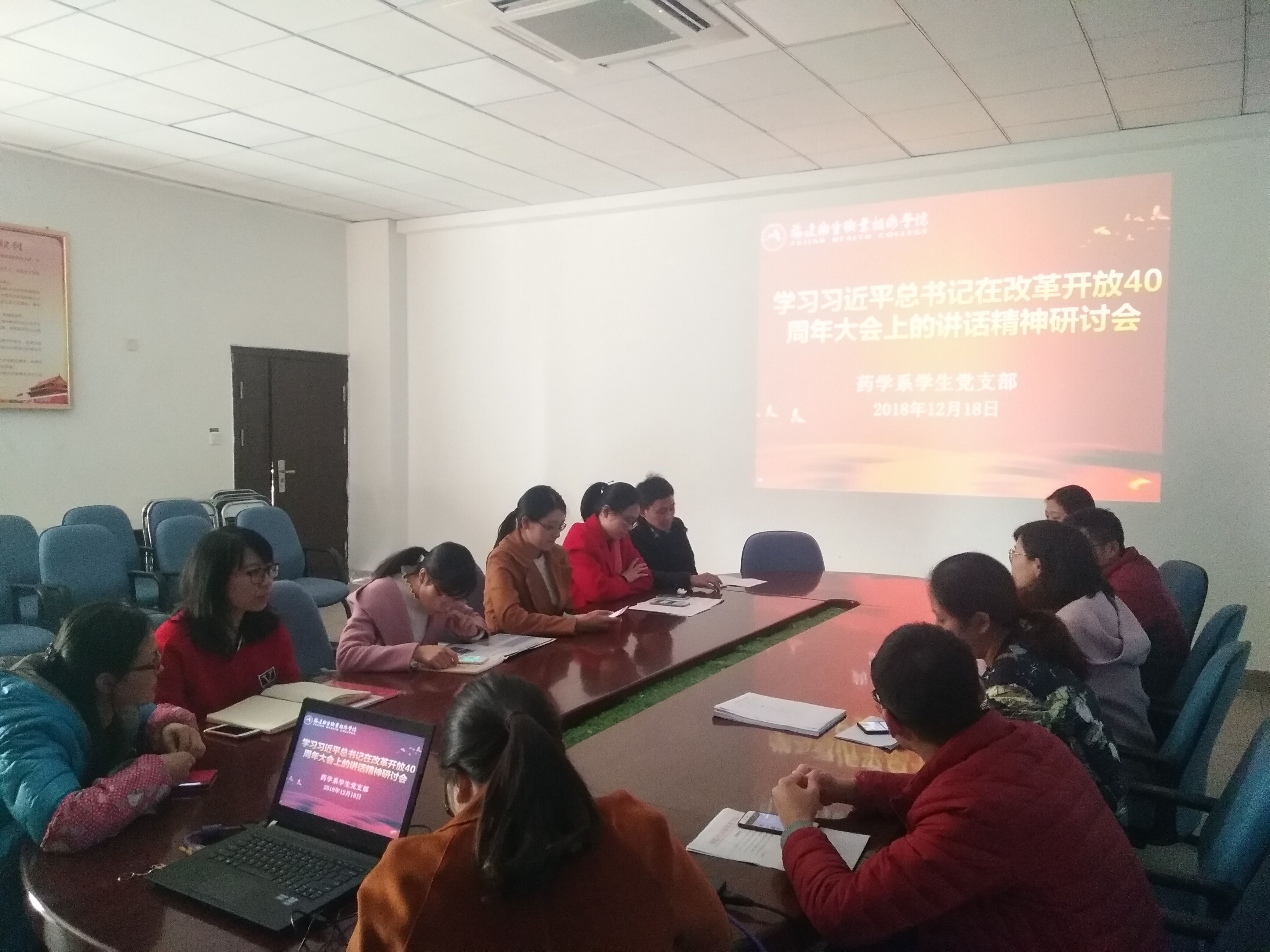 2018年12月18日上午10点,药学系党总支组织党员观看庆祝改革开放40周年大会。改革开放是决定当代中国命运的关键一招,也是实现“两个一百年”奋斗目标、实现中华民族伟大复兴的关键一招。为了更好地学习贯彻习近平总书记在庆祝改革开放40周年大会上的重要讲话精神,药学系学生党支部组织党员开展了专题研讨会。