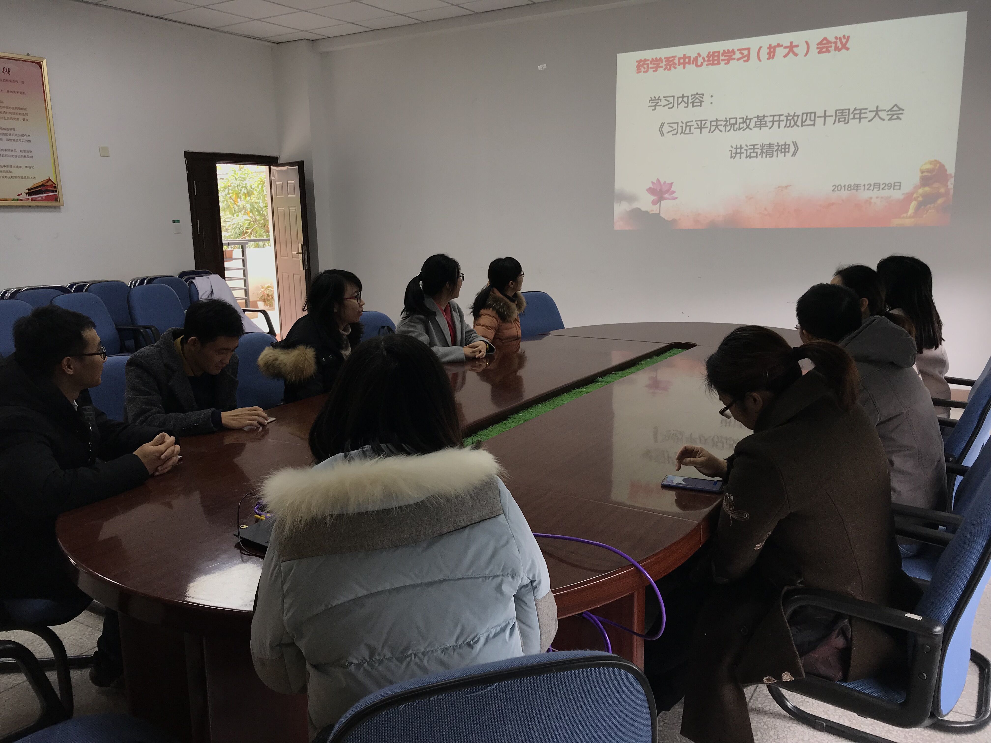 12月29日,药学系党总支组织召开中心组学习(扩大)会,专题学习习近平总书记在庆祝改革开放四十周年大会的重要讲话精神。总支委员、各支部书记及辅导员们参加了本次学习。会议由党总支副书记陈洁主持。
