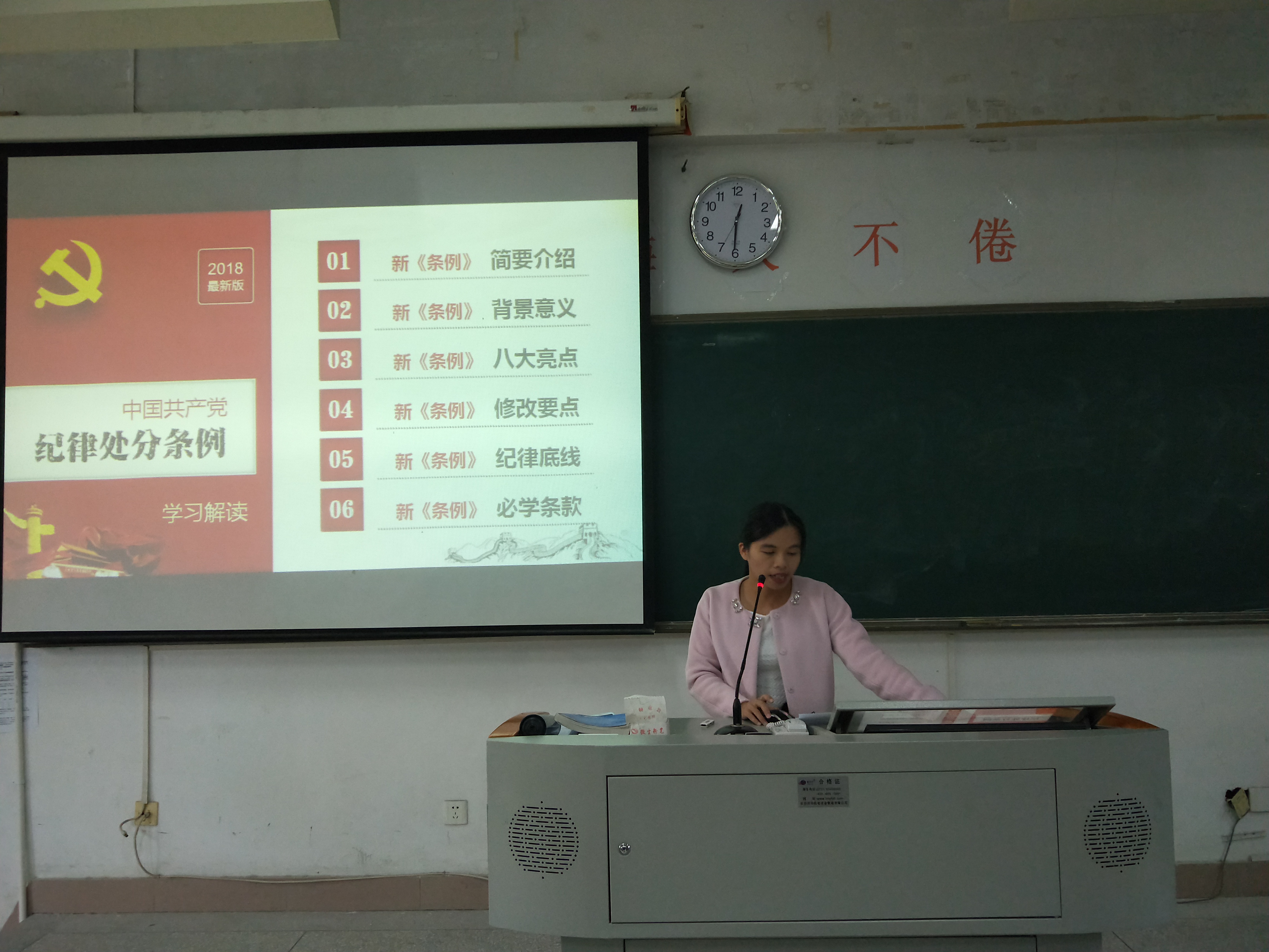2018年11月23日,药学系于药二阶开展业余分党校第四讲,本次培训主题是学习解读2018新版《中国共产党纪律处分条例》,由药学系第一党支部书记郭丹老师主讲。